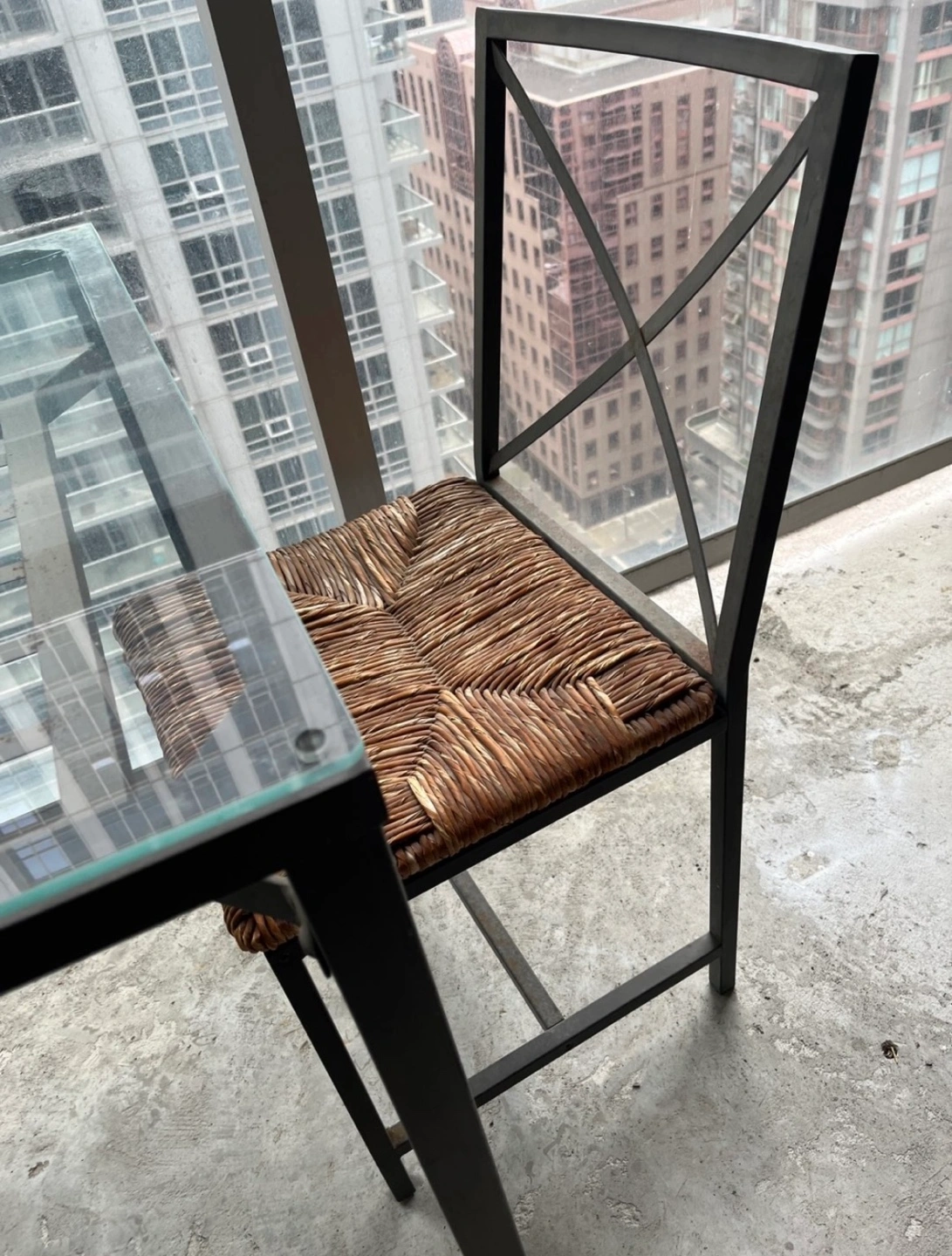 Small balcony table and two chairs. Metal frame, glass tabletop, woven chair seats.