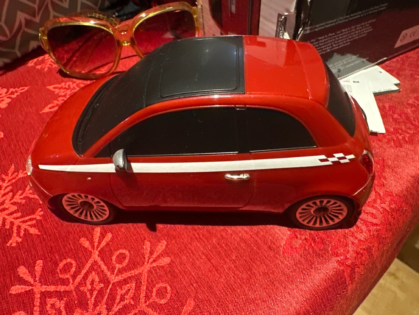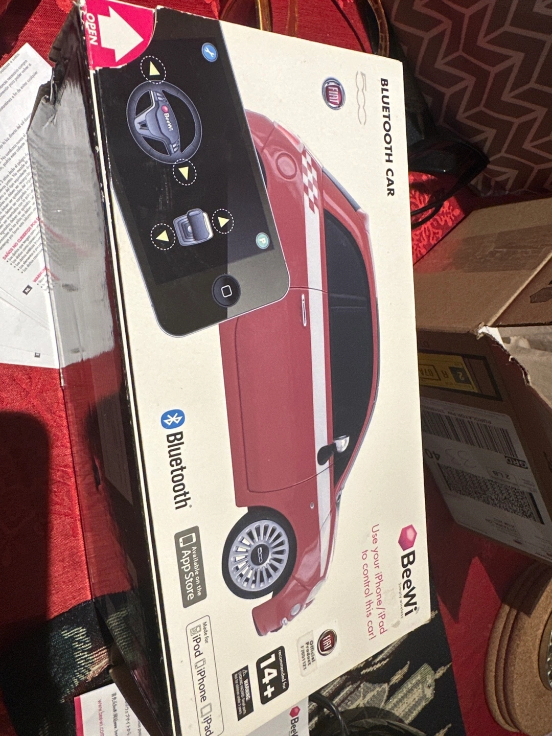 Red Fiat 500 Bluetooth controlled toy car. Includes box and instructions. Ages 14+. Great physical condition but not sure if it works. We never tried to run it.