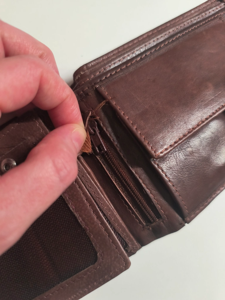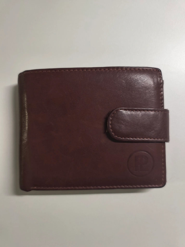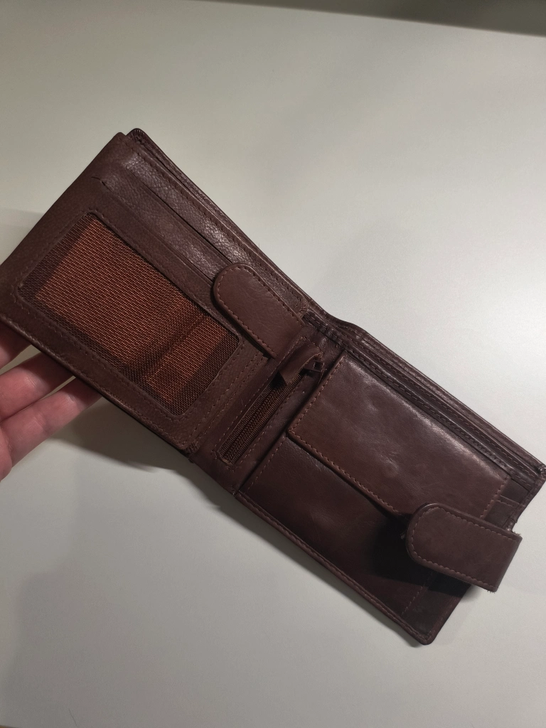 Men's brown leather bifold wallet. Multiple card slots, zippered coin pocket, and billfold. Features a leather closure strap.