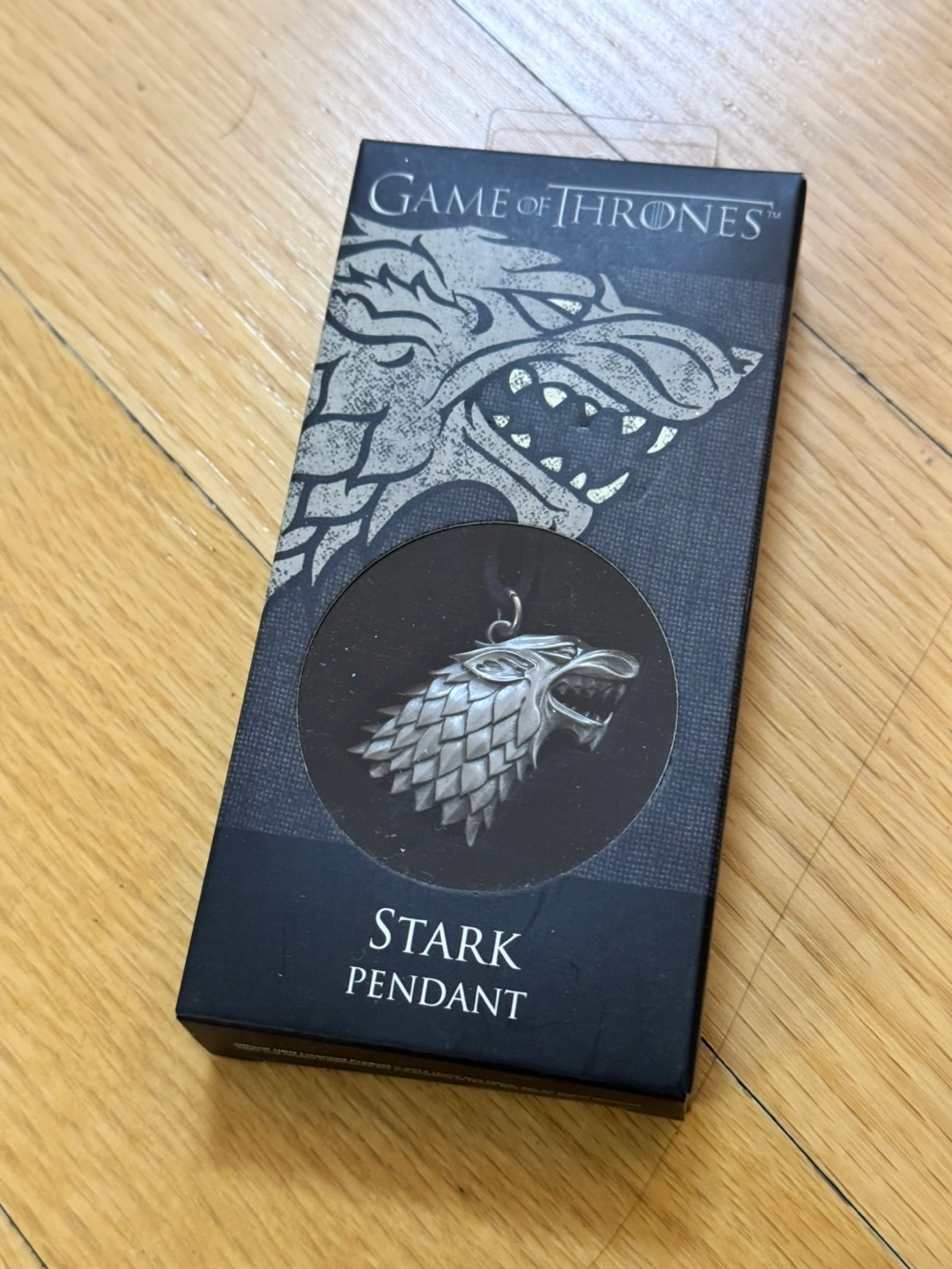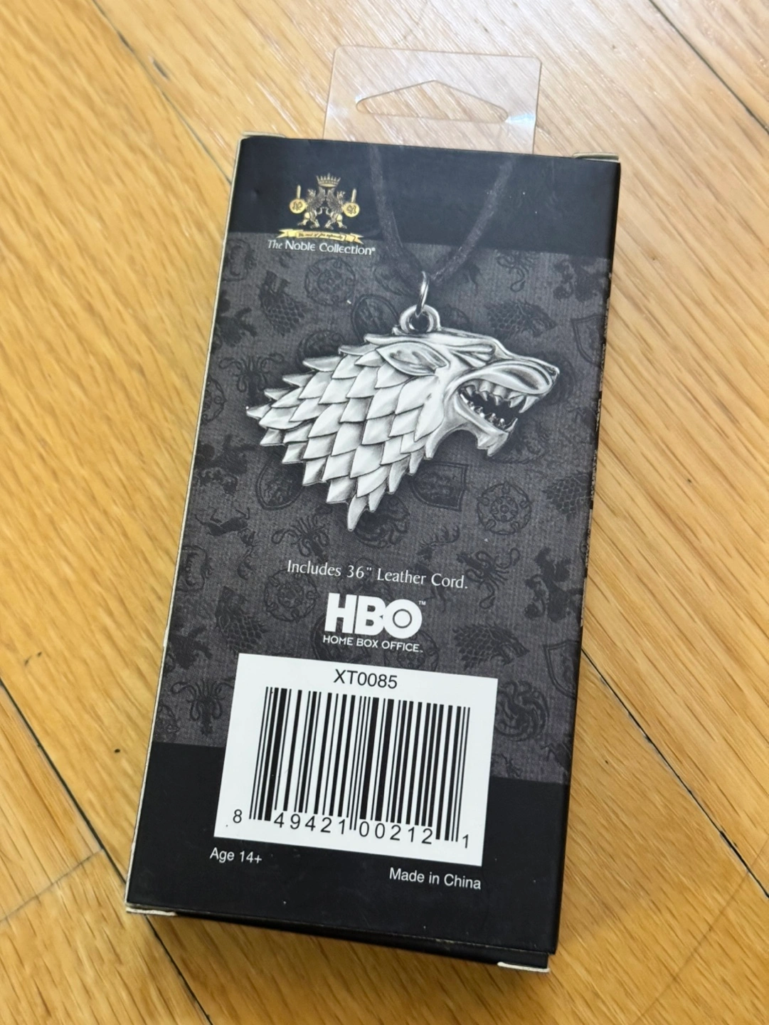 New Game of Thrones Stark pendant necklace. Silver-toned metal pendant. Includes 36" leather cord. Officially licensed HBO product. Brand new in original box. Pickup is on 72nd and 1st in Manhattan. Preference given to whoever schedules pickup first.
