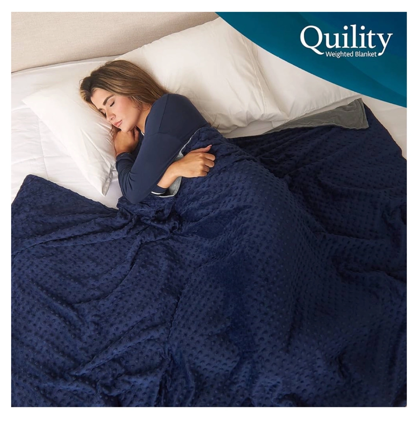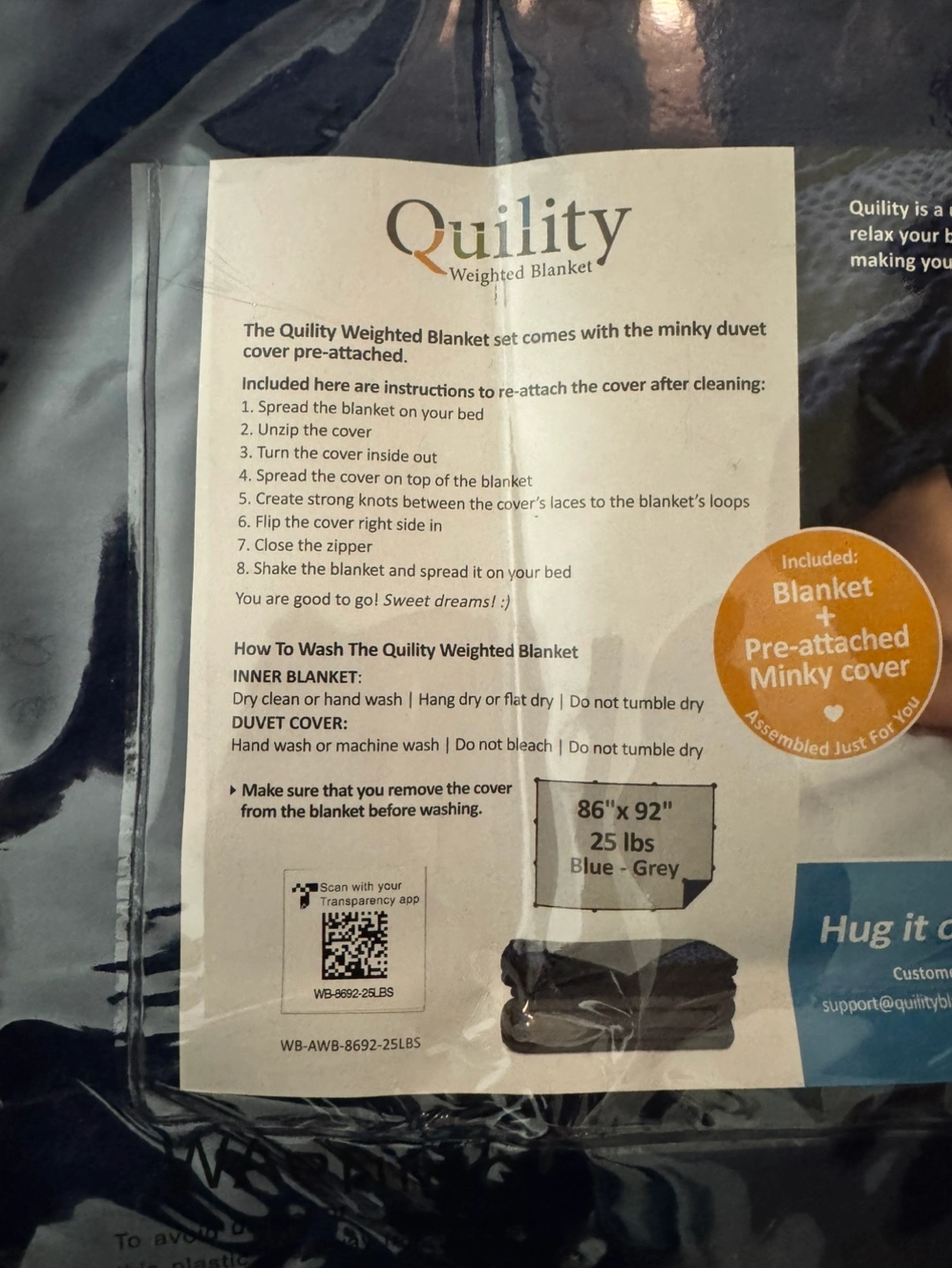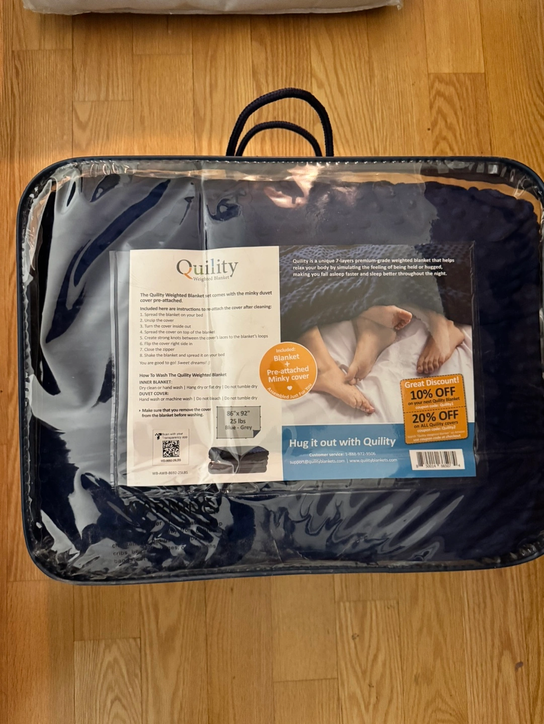 Brand new in packaging. Weighted blanket, King size, 25 lbs. Navy blue. Machine washable. Includes pre-attached minky cover. Soft and comfortable. Pickup is on 72nd and 1st in Manhattan. Preference given to those who can pickup by 2/9.