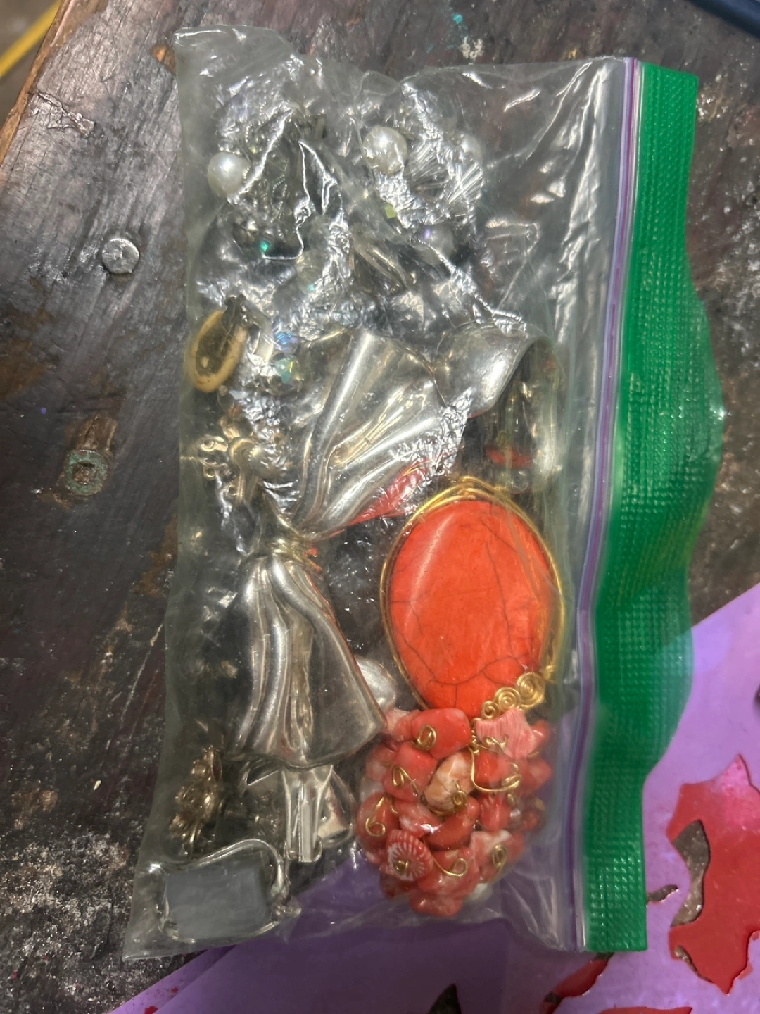 Bag of assorted jewellery findings. Includes metal pendants, earrings, beads, and stones. Some pieces appear silver-toned, others gold-toned. Perfect for crafting or upcycling.