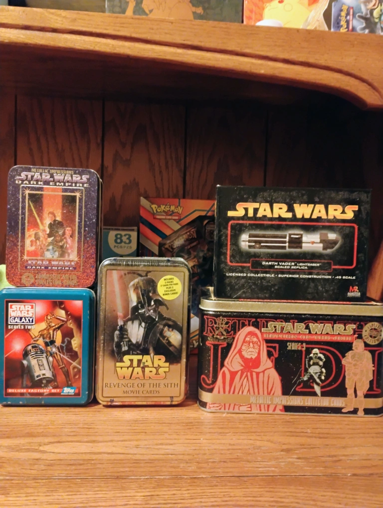 Collection of Star Wars tins. Includes Dark Empire, Revenge of the Sith movie cards, and Jedi tins. Also, a Darth Vader lightsaber replica. Great for collectors.