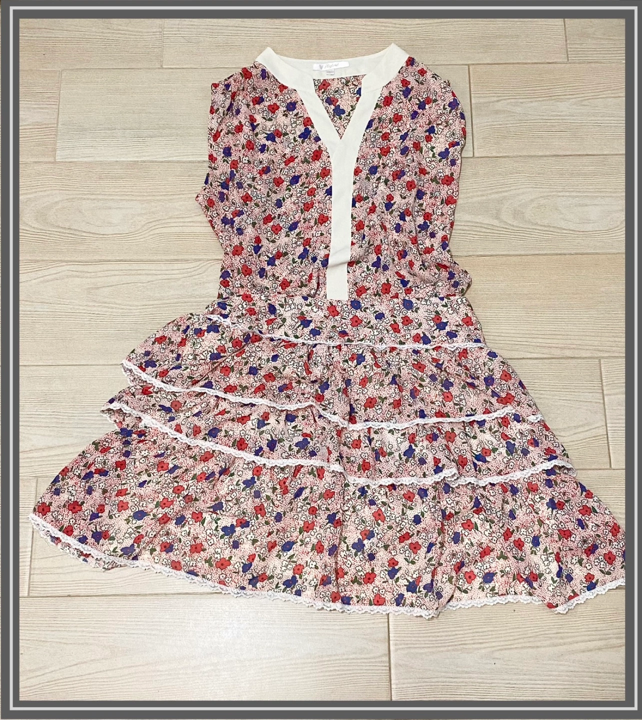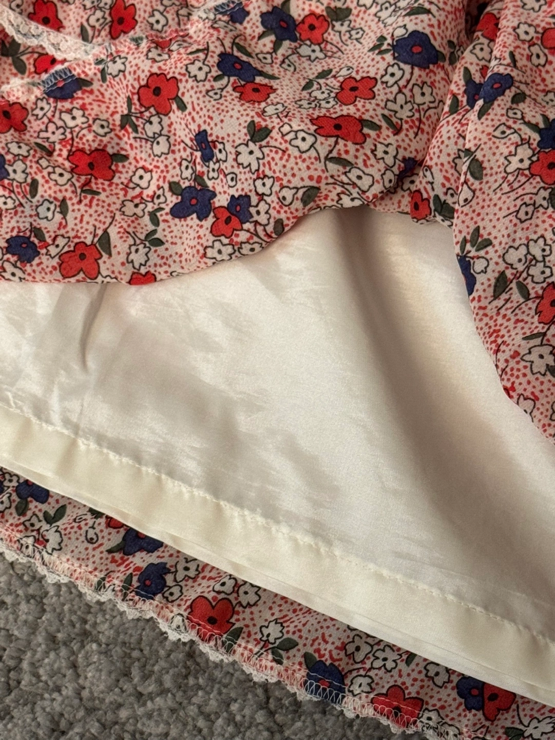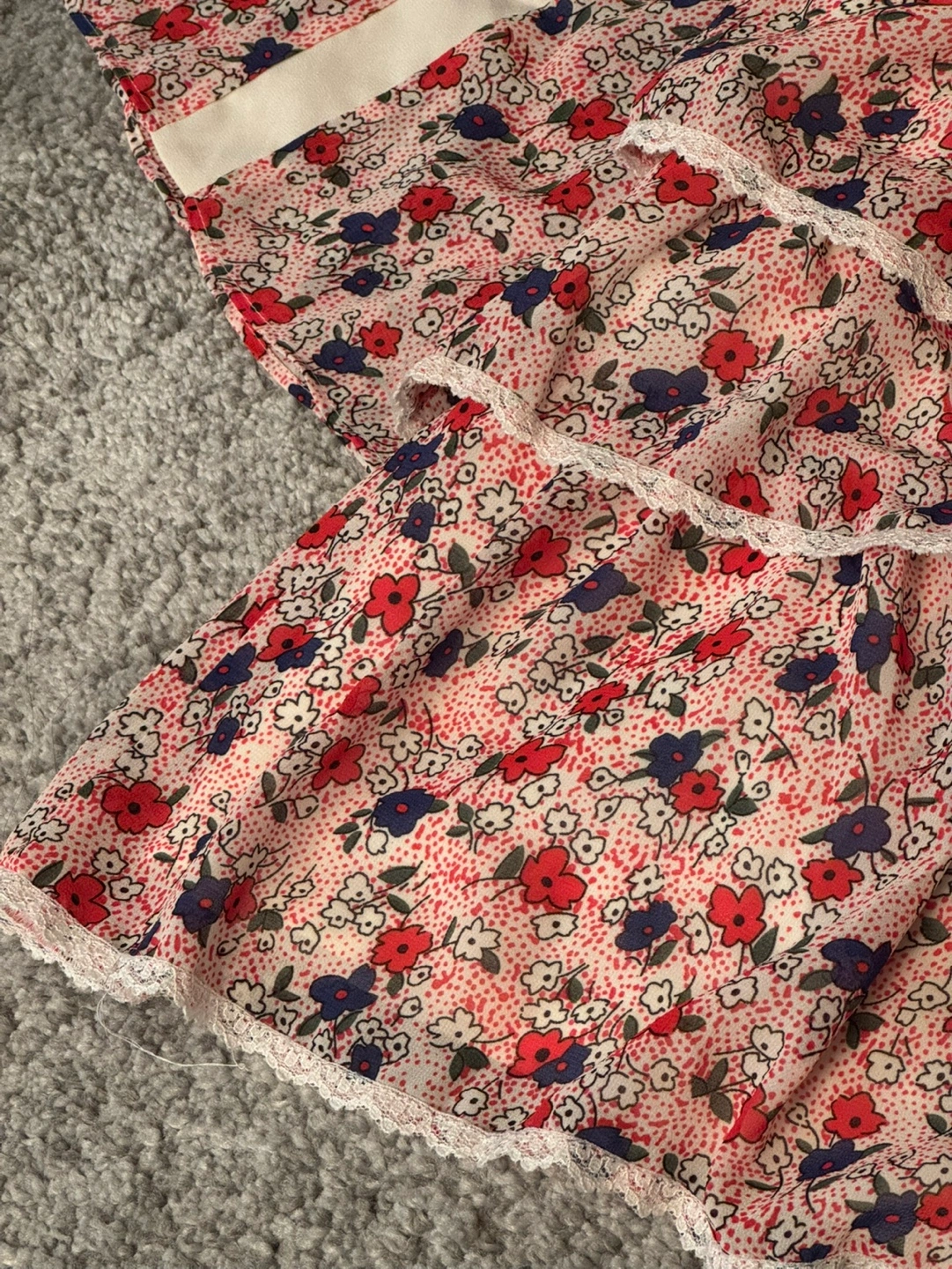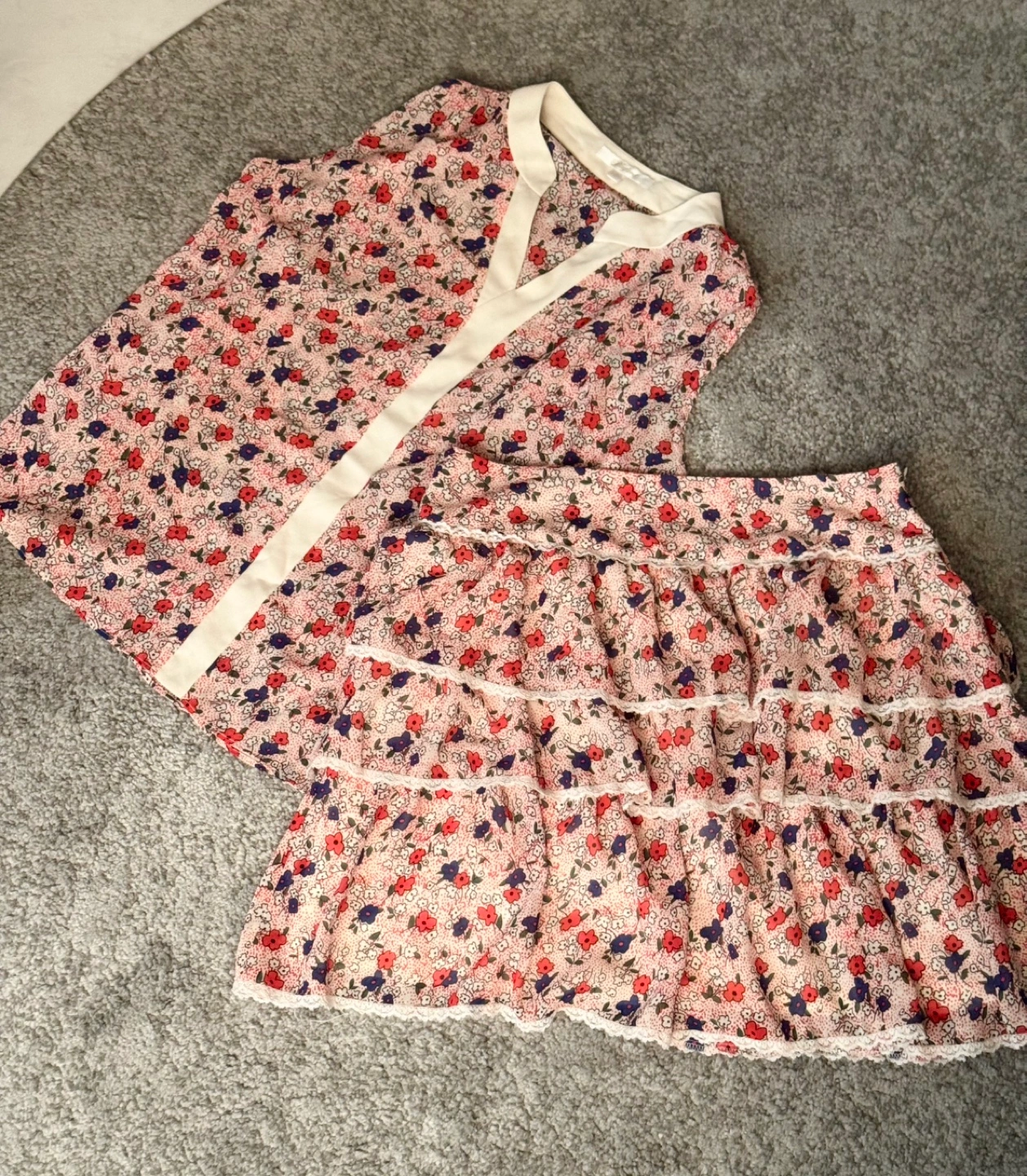 Adorable matching set. Features a sleeveless blouse and a tiered skirt. Both pieces are light and airy, perfect for summer. Red, blue and white floral print on a pink background. The skirt has a cream-coloured lining.