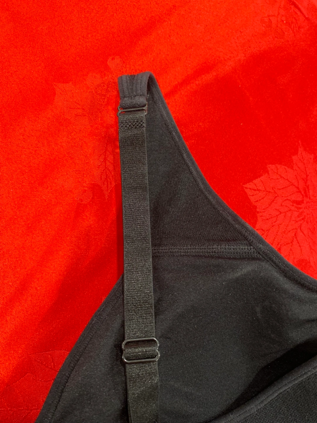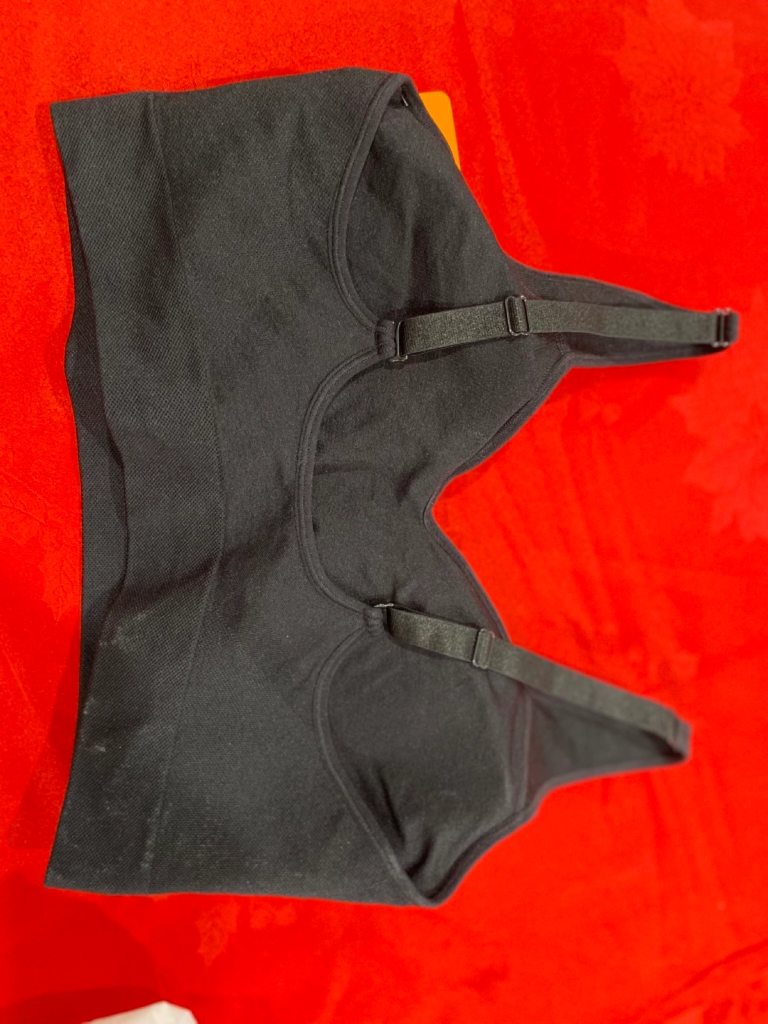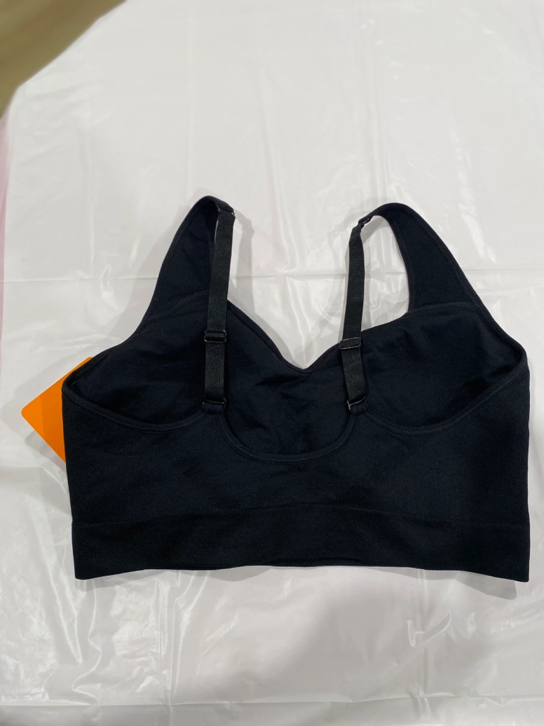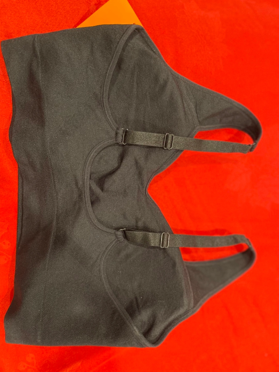 Black seamless sports bra. Adjustable straps. Great for low-impact workouts or everyday wear. Comfortable and supportive.