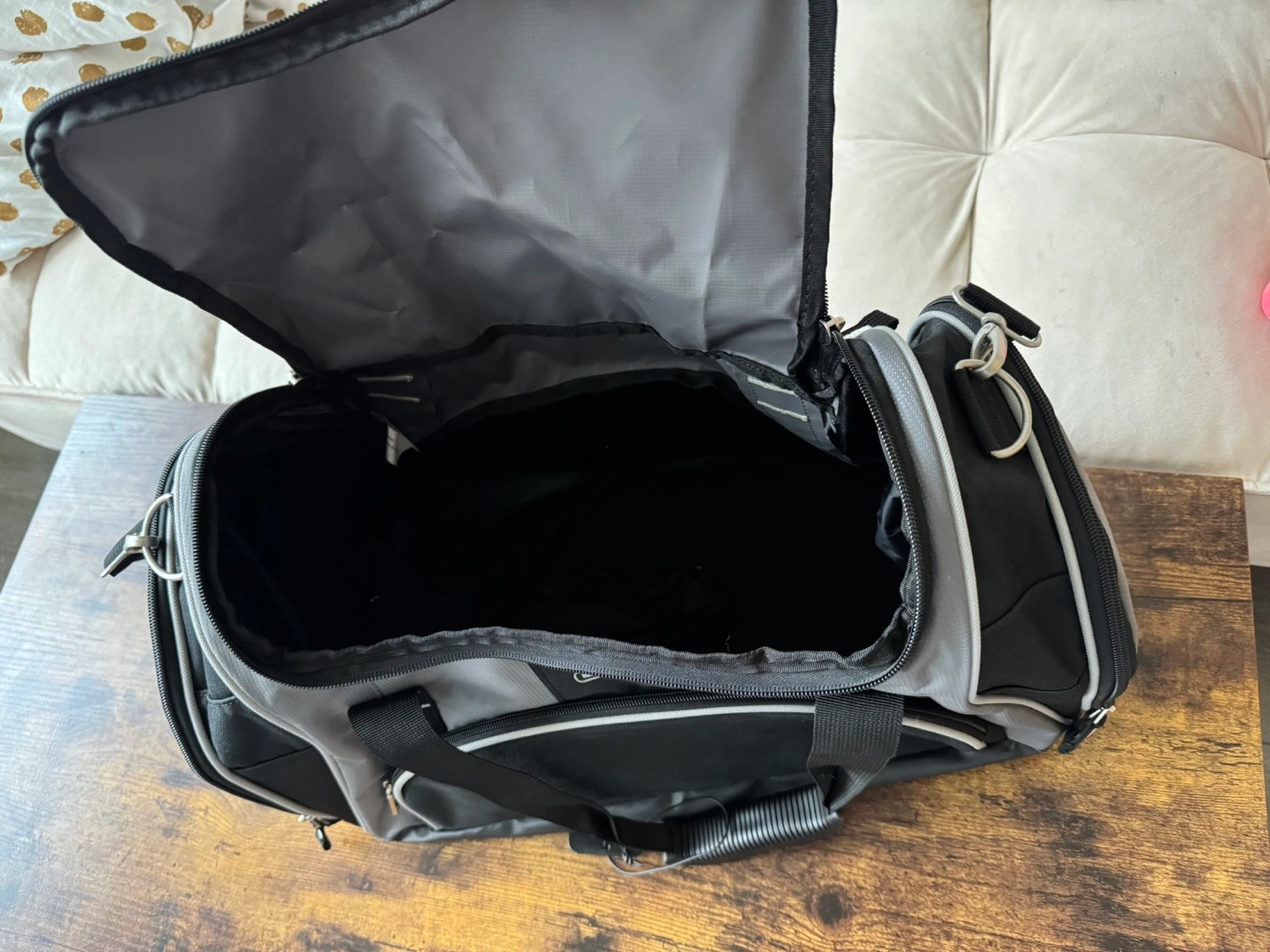 Durable duffle bag. Grey and black colour scheme. Multiple compartments. Great for travel or sports.