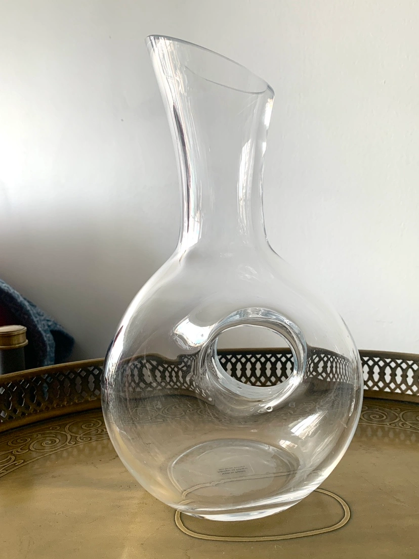 Thick glass decanter featuring a unique circular cutout in the body. Perfect for serving water or other beverages. Adds a touch of sophistication to any table.