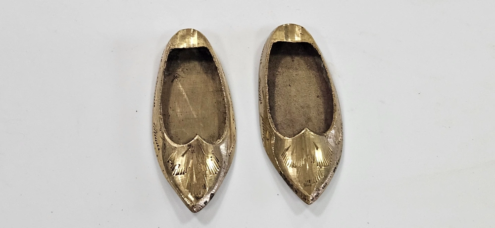 Pair of vintage brass ashtrays. Shaped like miniature shoes. Intricate detailing. Great for collectors or unique home decor.