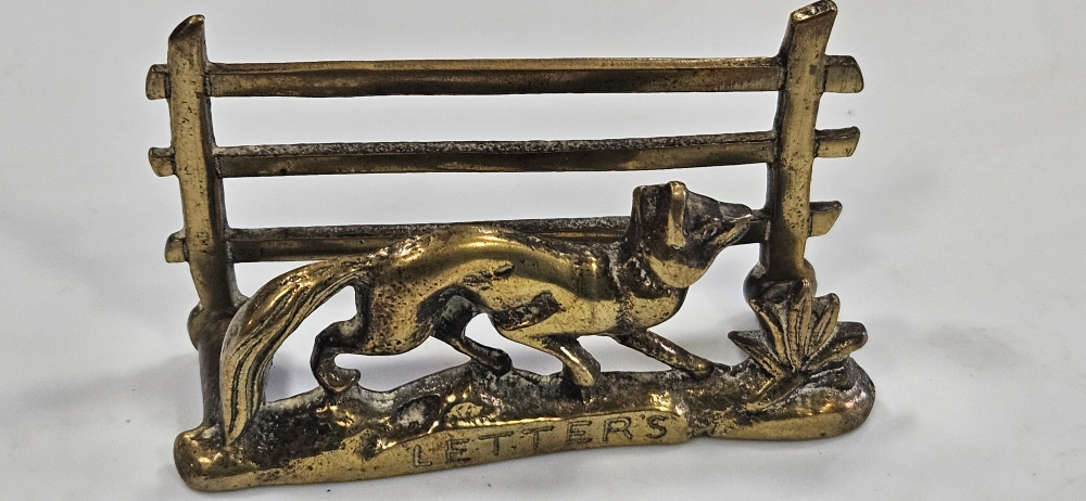 Ornate brass letter holder. Features a fox figurine jumping over a fence. Small and decorative. Ideal for desk or mantlepiece.