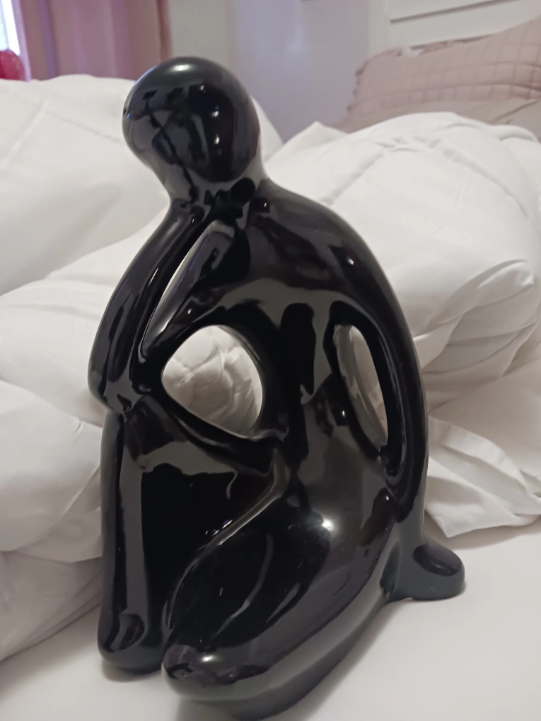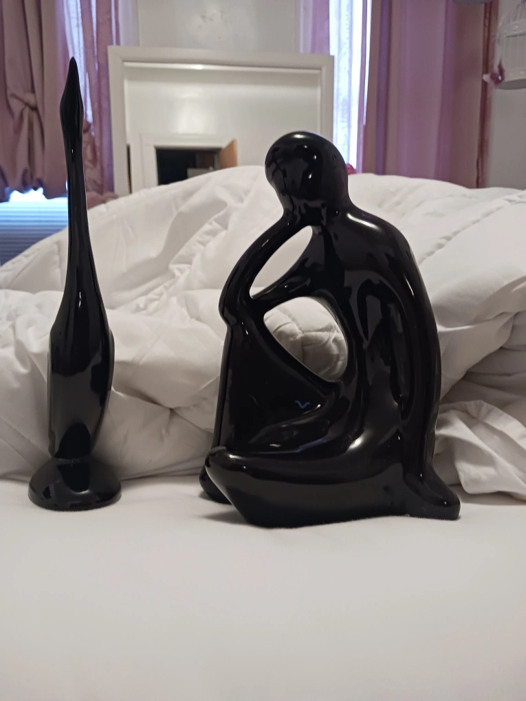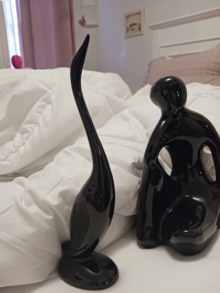 Two glossy black ceramic figurines. One depicts a seated human figure, the other a swan. Modern minimalist style. Perfect for a shelf or mantle.