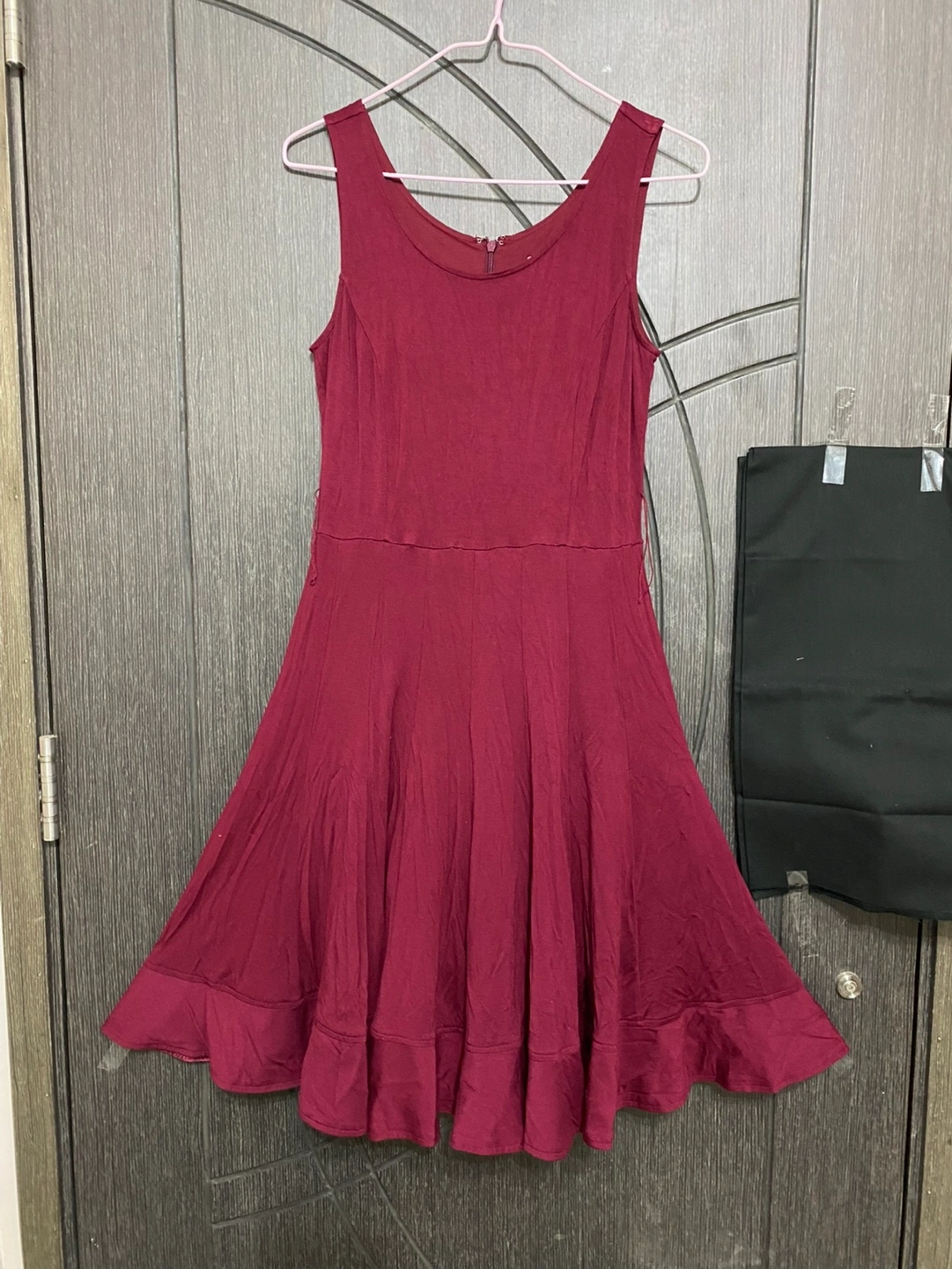 A-line burgundy sundress. Features sleeveless design and a scoop neckline. Simple and elegant style.