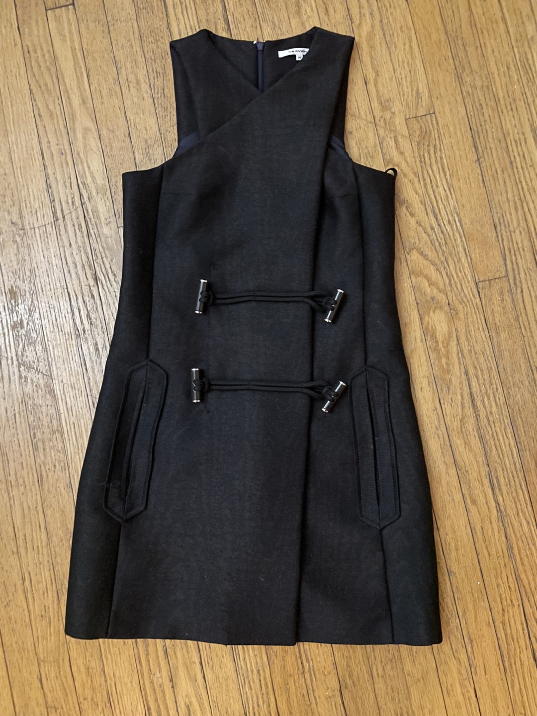 Designer Carven dress from F/W 2014 season. Features a back zipper and two functional toggles at the waist. Double lined and two front pockets. Woven fabric. Size 36. 90% virgin wool, 10% polyester. Original price $800. Selling for $80 OBO
