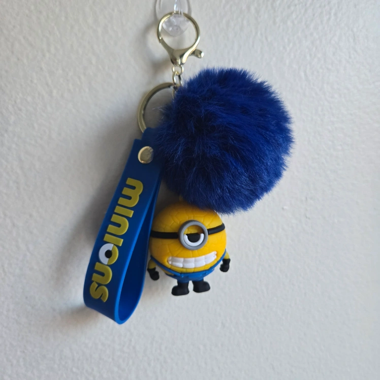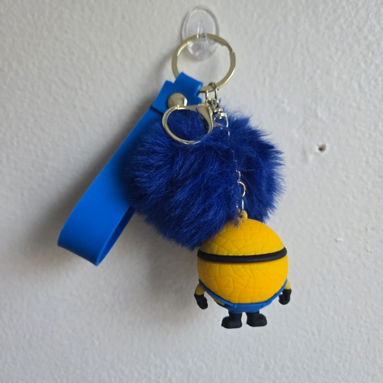 This is a handmade key chain holder with a 3D cute Minions character and features a blue pom-pom detail that adds a soft and playful texture that's hard to resist. It is made of Silicone PVC, plastic, and metal materials and features a vibrant, colorful blue and yellow design. This keychain is not just a statement piece but also a functional accessory that keeps your keys organized. The key chain is a perfect accessory for fans of the Minions characters and can serve as a fun and practical backpack clip. Proudly made by me personally, this one-size key chain is an ideal gift or a charming addition to your bag or keys.
