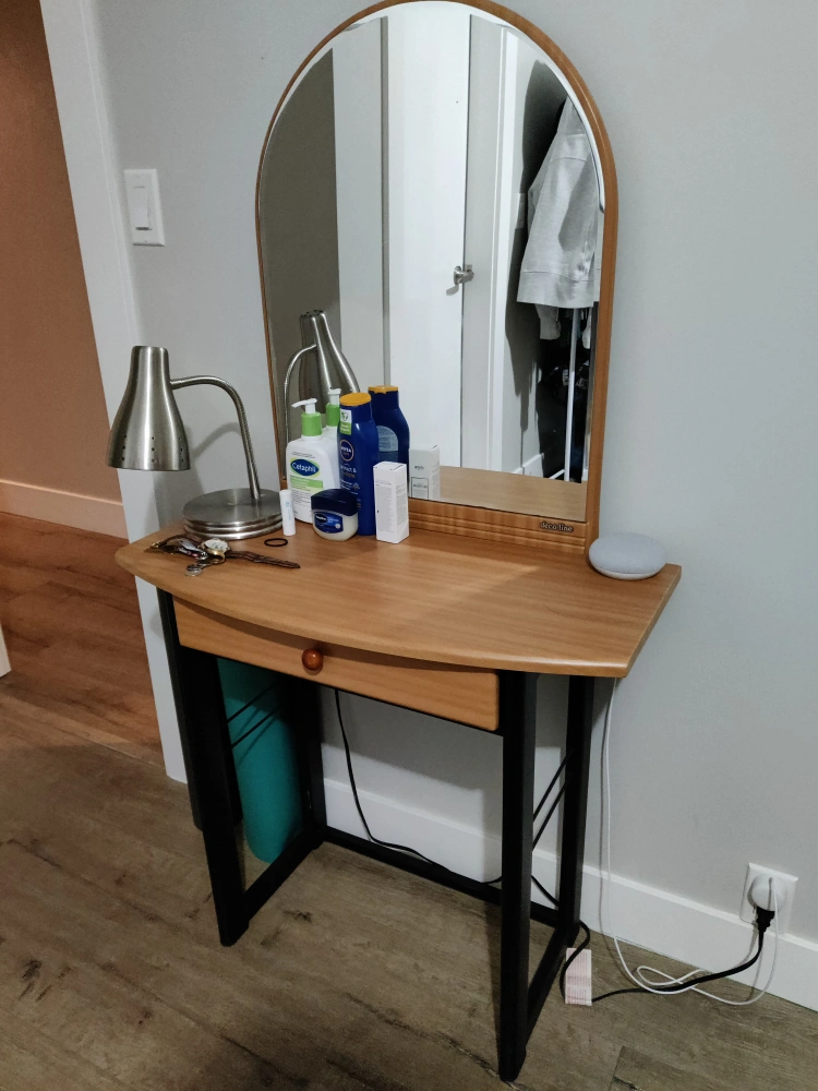 Wooden vanity table with a curved mirror. Features one drawer and black metal legs. Compact size, ideal for smaller spaces. Some minor wear.