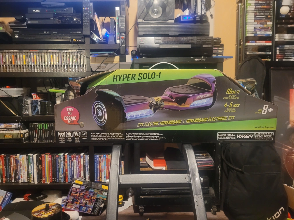 used Hyper Solo-1 hoverboard. 37V electric hoverboard. Top speed 10km/h. 4-5 hour charge time. Recommended for ages 8+, comes with manual,and charger,there is an app to pair it to your phone,there was an issue with this hoverboard but you can buy a go cart attachment if you’re not comfortable standing on it