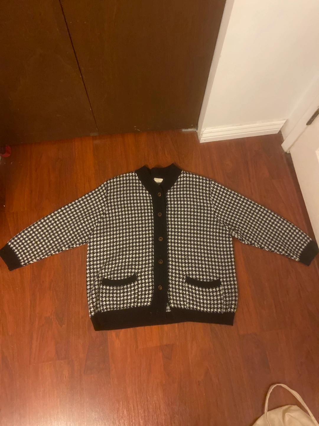 Women's vintage black and white houndstooth patterned cardigan. Features a button closure and two front pockets. Made in Canada. Price and place negotiable.