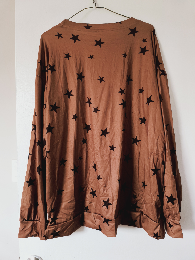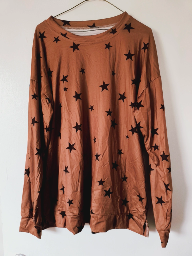 Long sleeve top. Brown colour. Star print. Relaxed fit. Comfortable material. Great for casual wear.