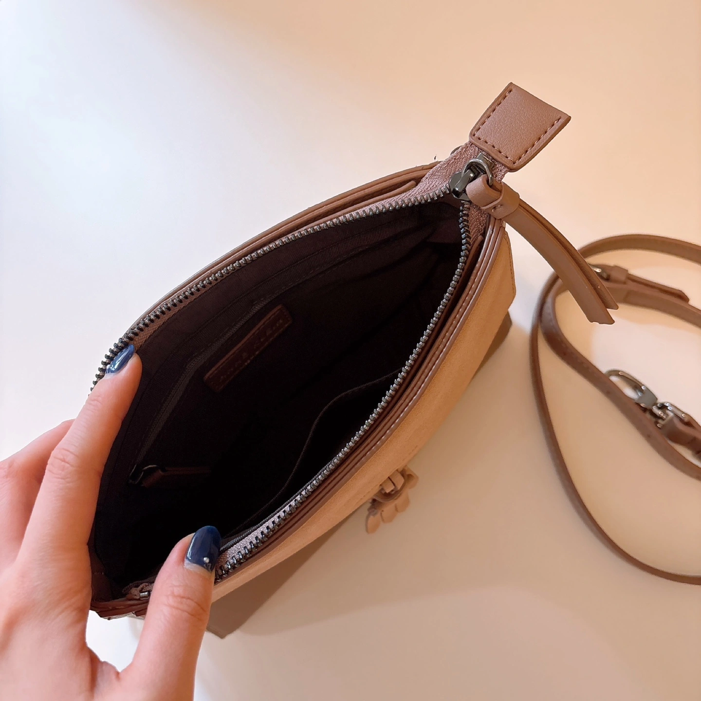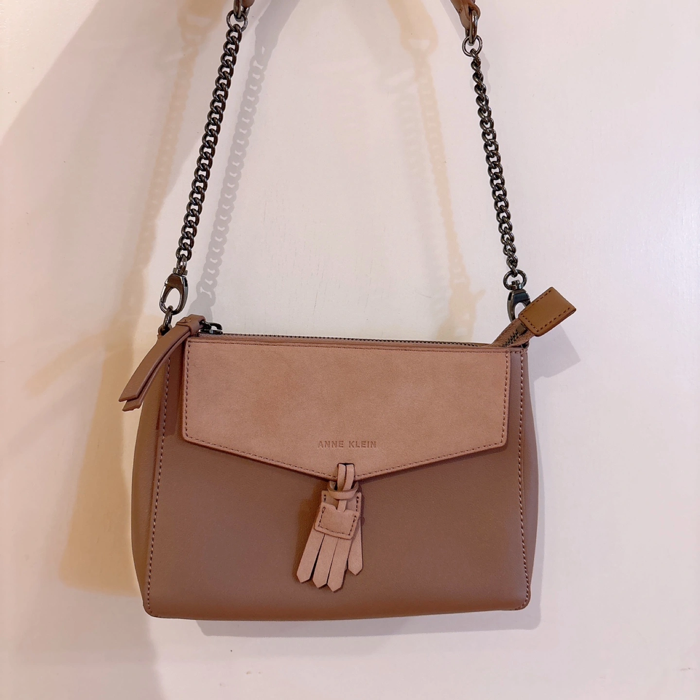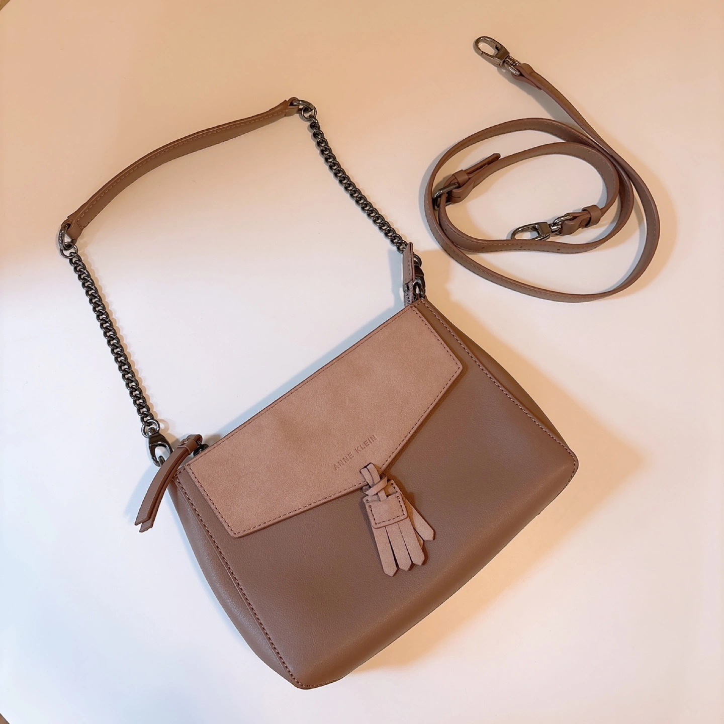 Features a taupe leather exterior, suede detail, and a dark metal chain strap.
