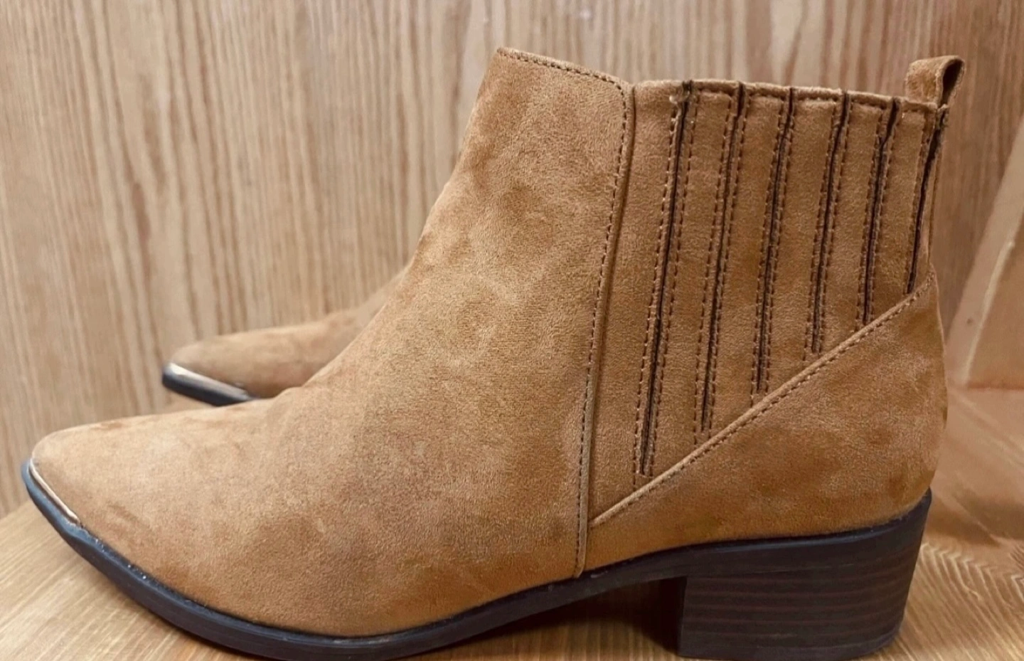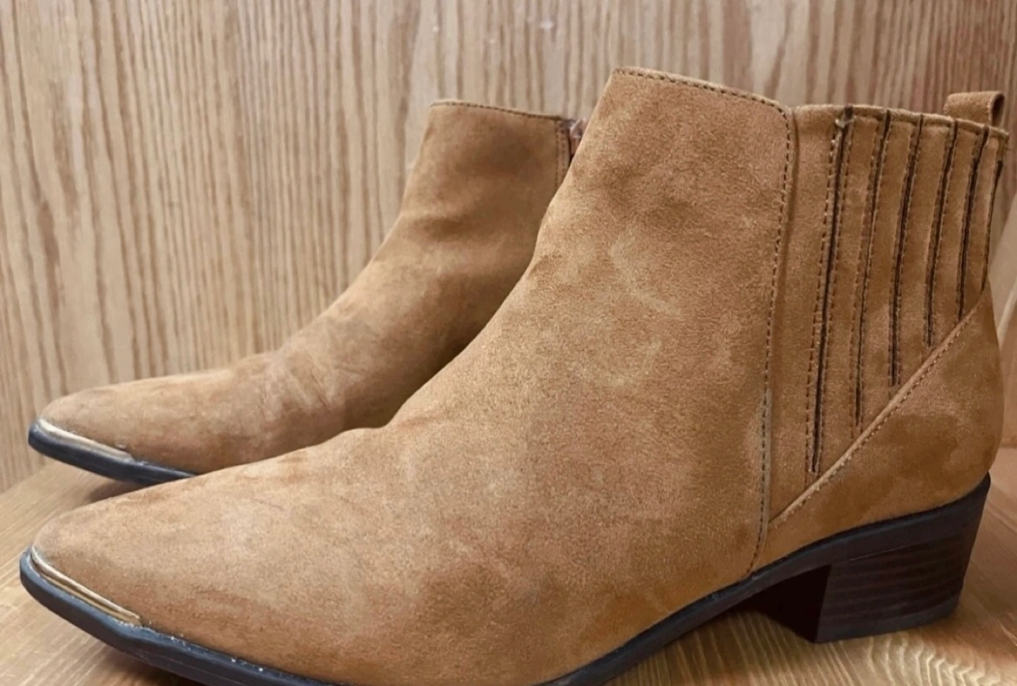 Brown suede ankle boots. Pointed toe. Low block heel. Gold coloured accents. Elastic side panel.