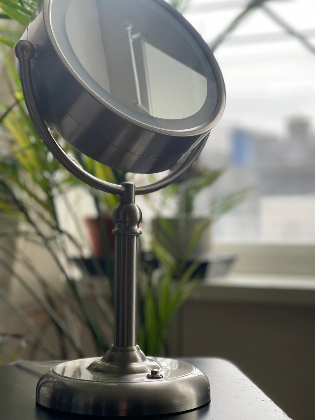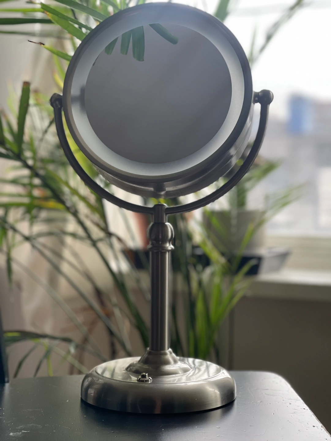 Silver-toned tabletop mirror. Features a circular light around the mirror's edge. Cord for power. Swivel arm for adjustable viewing angles. Compact design.