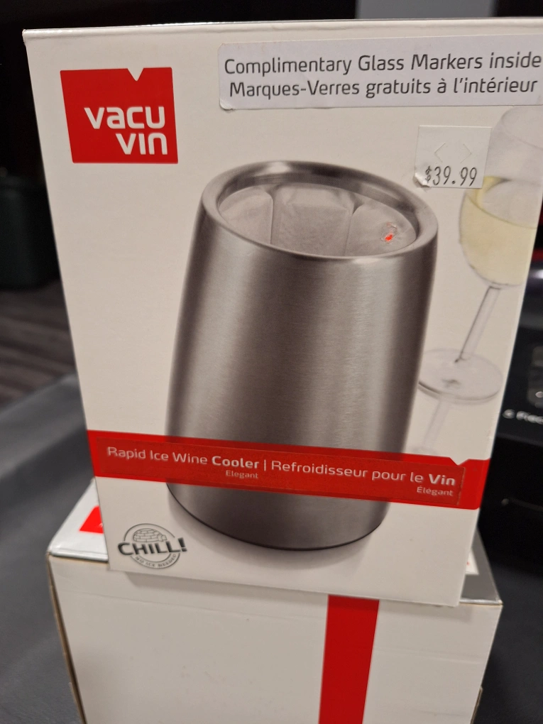 Elegant stainless steel wine cooler. Rapid ice cooling. Includes complimentary glass markers.