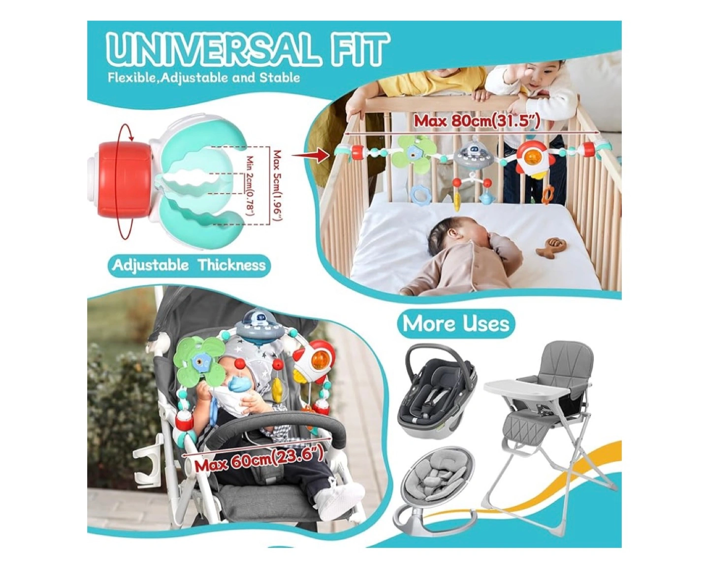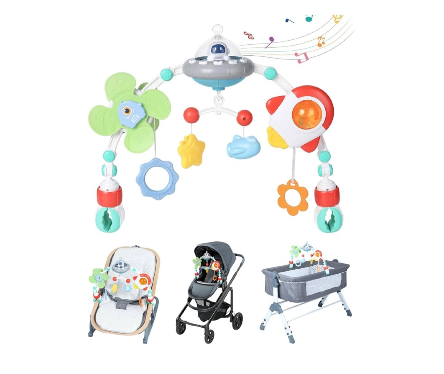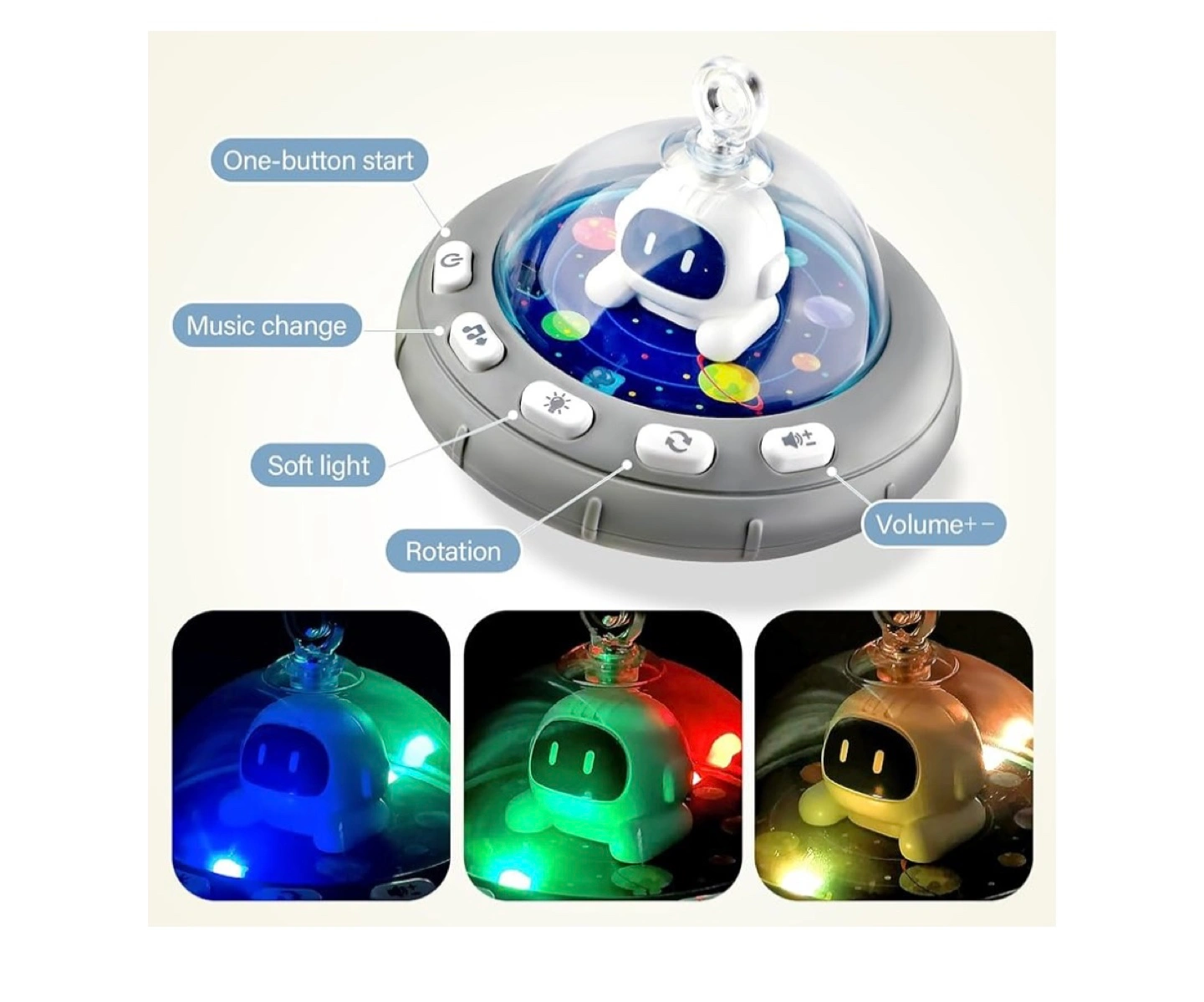 Adorable astronaut-themed mobile. Features soft lights, music, rotation, and volume control. Attaches easily to cribs, strollers, and car seats. Great for soothing babies.