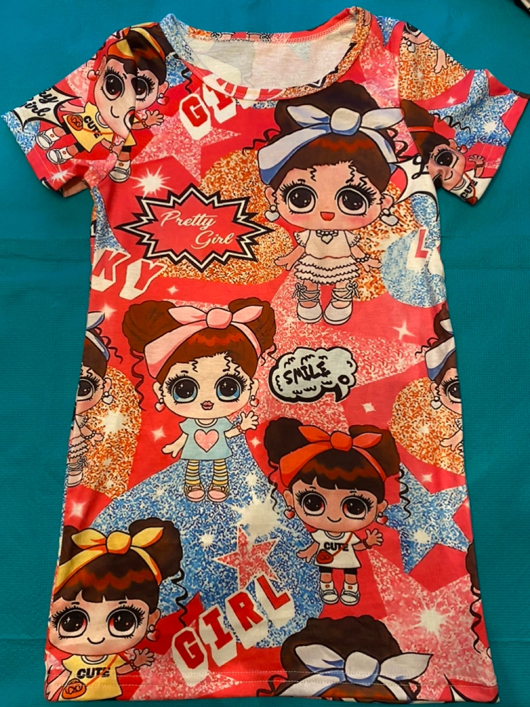 Cute short sleeve t-shirt dress. Features a colourful print of cartoon girls. Perfect for summer.