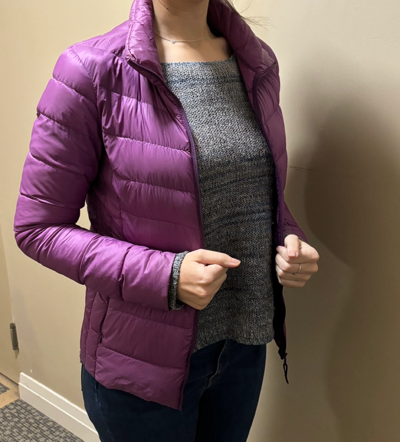 Bundle includes a purple UNIQLO Ultra Light Down Jacket, 2 other lightweight jackets, and an orange cardigan. Jacket features a stand collar and zipper closure.