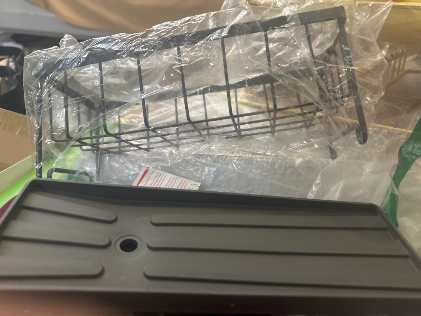 Brand new, never used dish drying rack and tray. Grey metal rack and plastic tray. Perfect for small kitchens or apartments. Easy to install, colour gray, brand new
