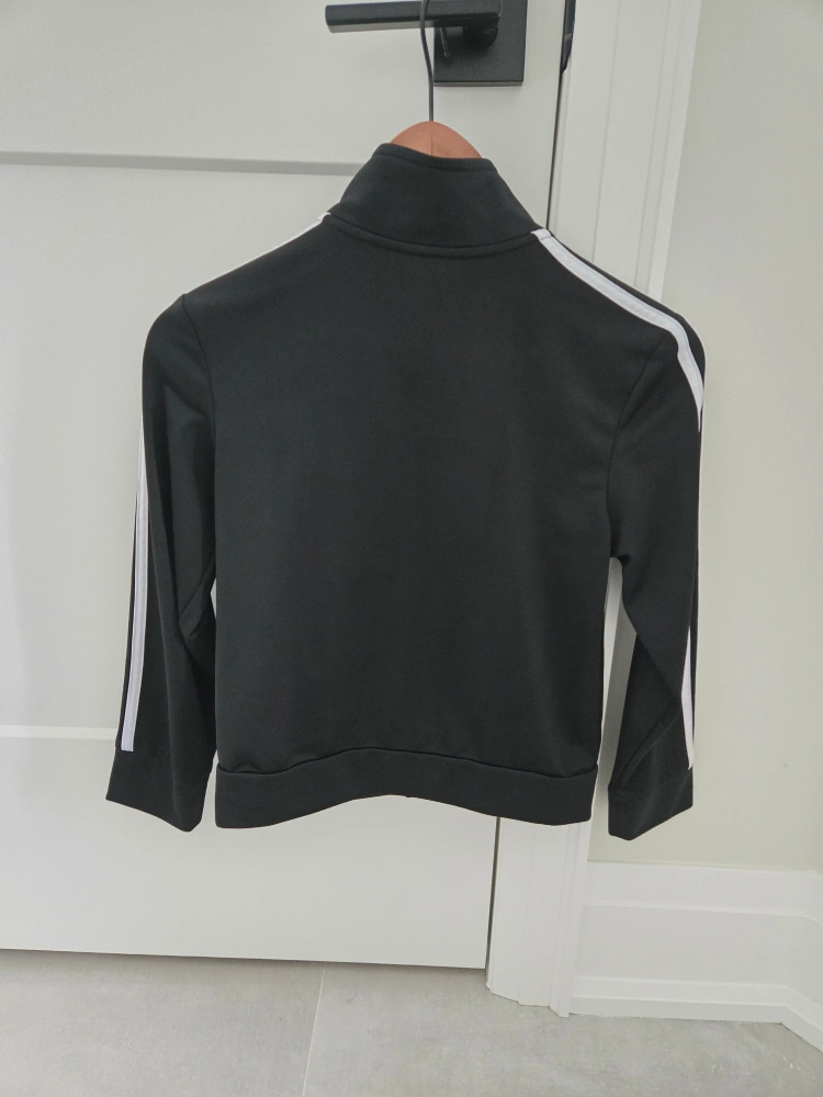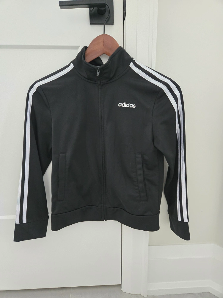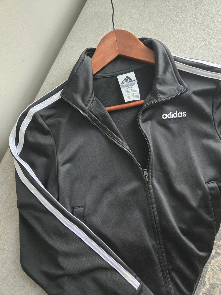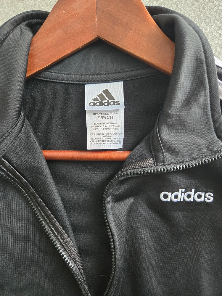Black Adidas track jacket. Size small/petite. Features white stripes down the sleeves and Adidas logo. Zip-up front. Like New condition.