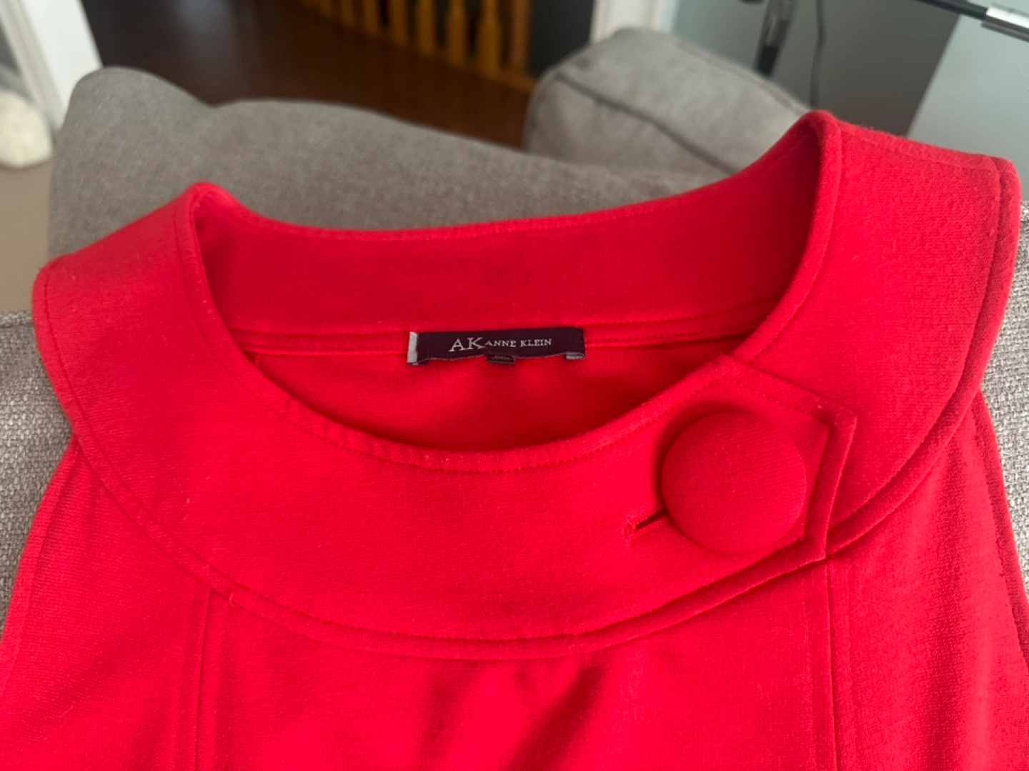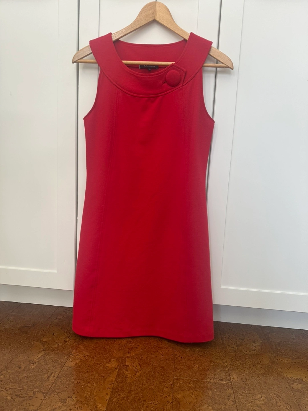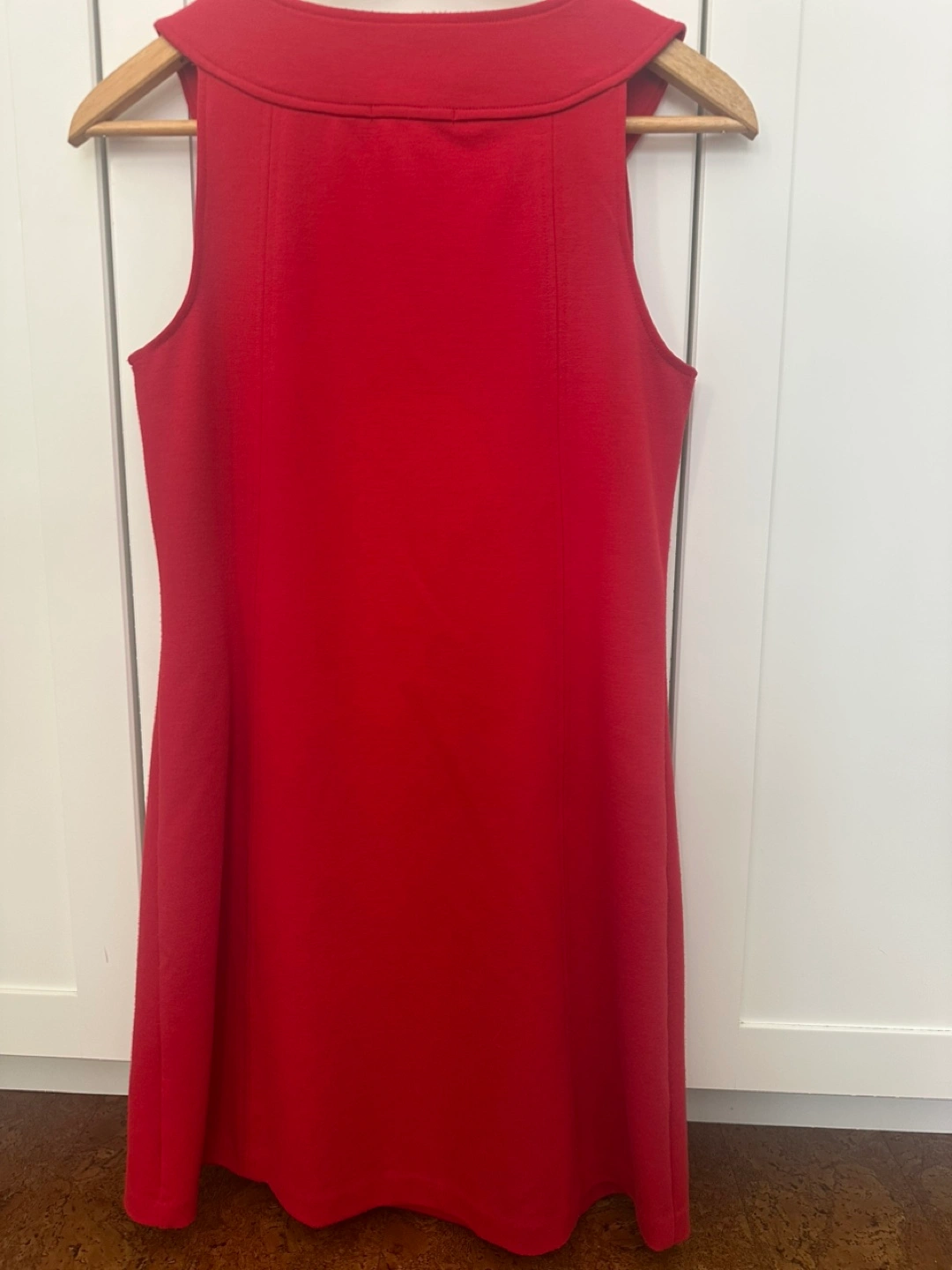 Red sleeveless shift dress. Round neckline, single button detail. A-line silhouette. Above knee length. Size small petite