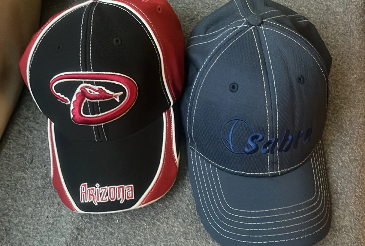 Set of two gently used baseball caps. One features the Arizona Diamondbacks logo, the other has an embroidered 'Sabres' logo. Both are in good condition. One is a 47 Brand. 10$ each