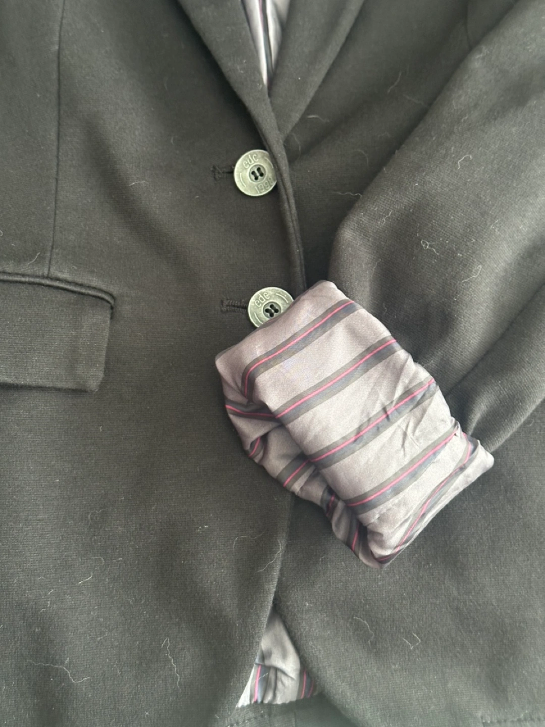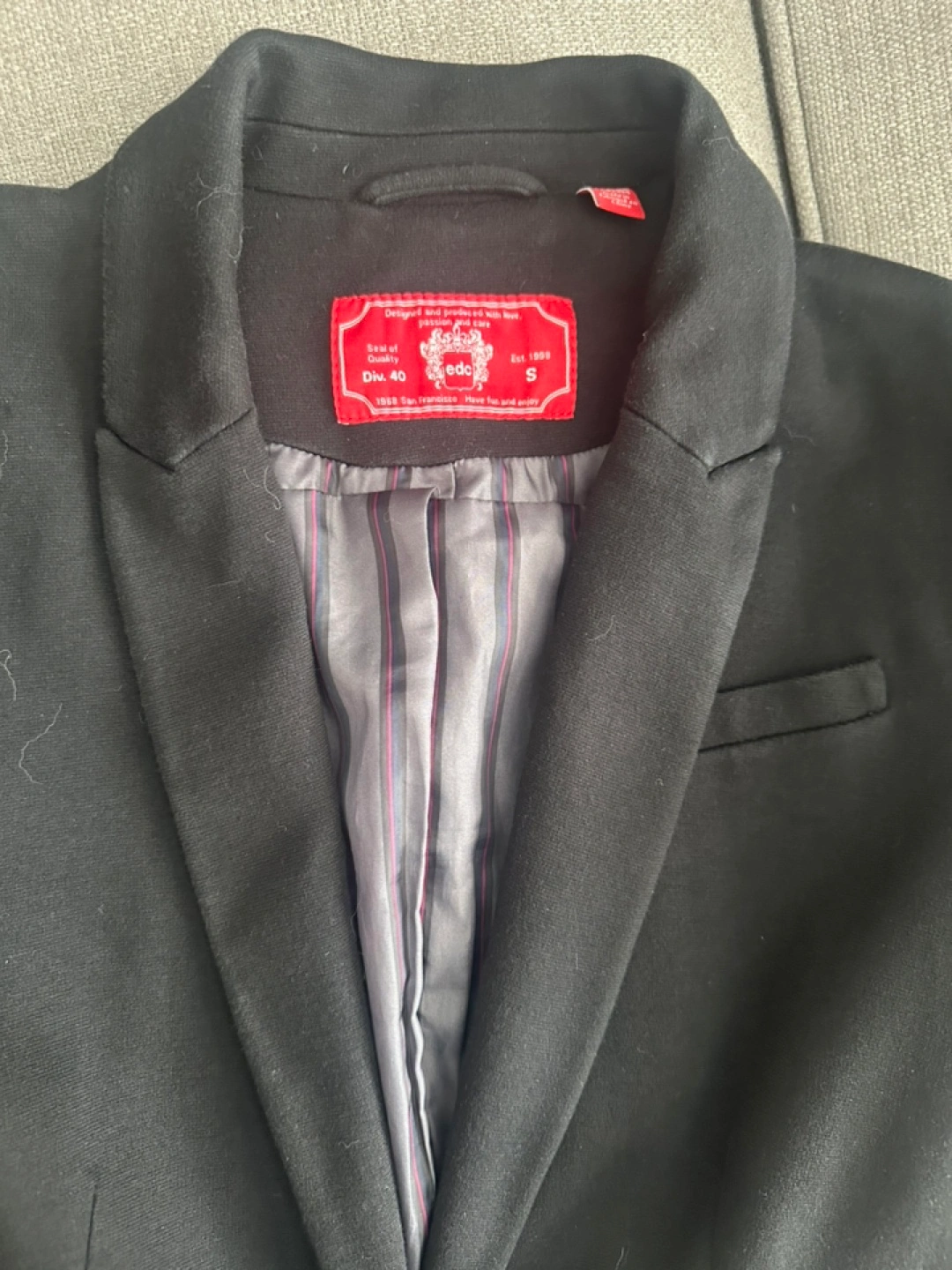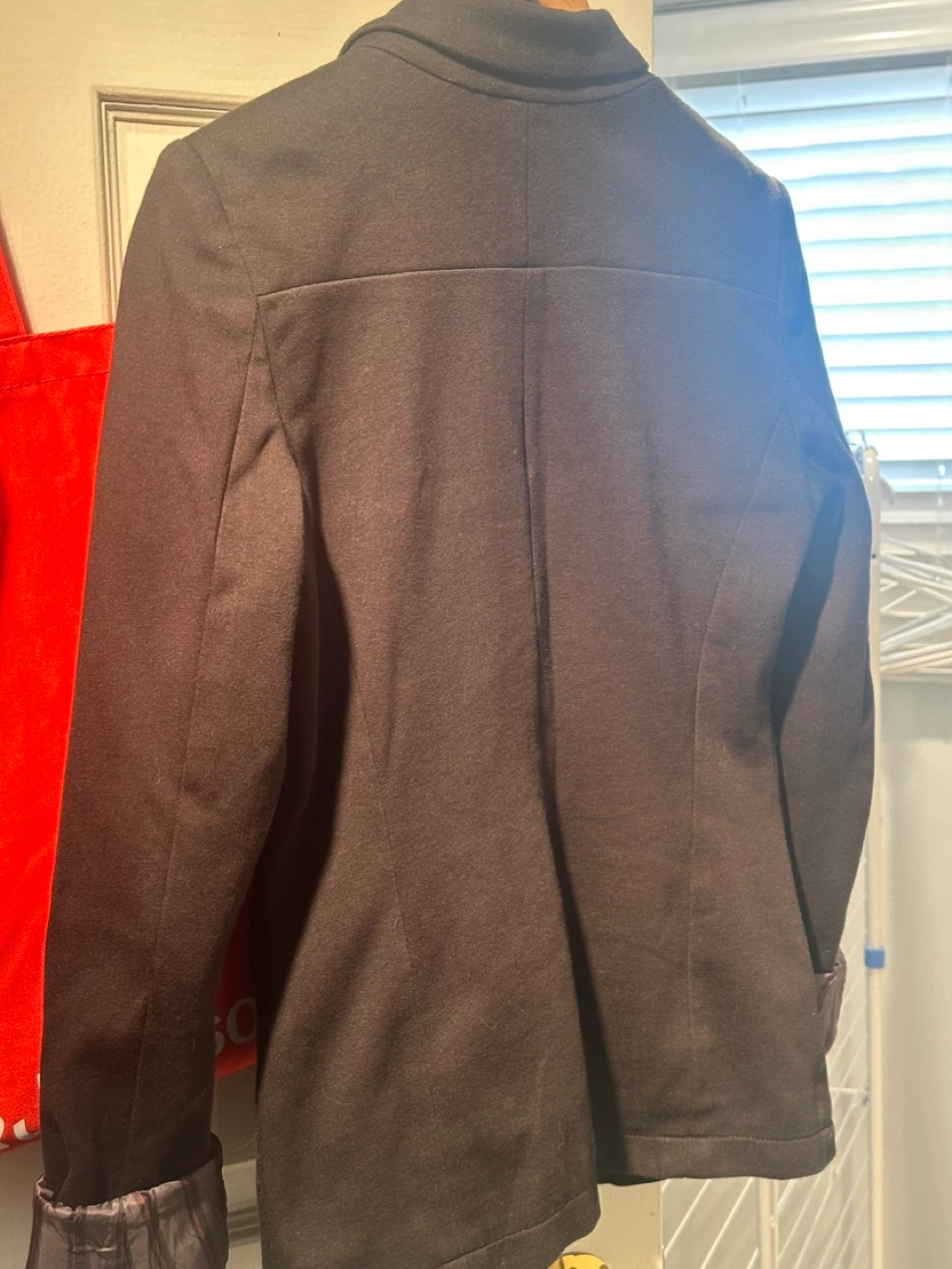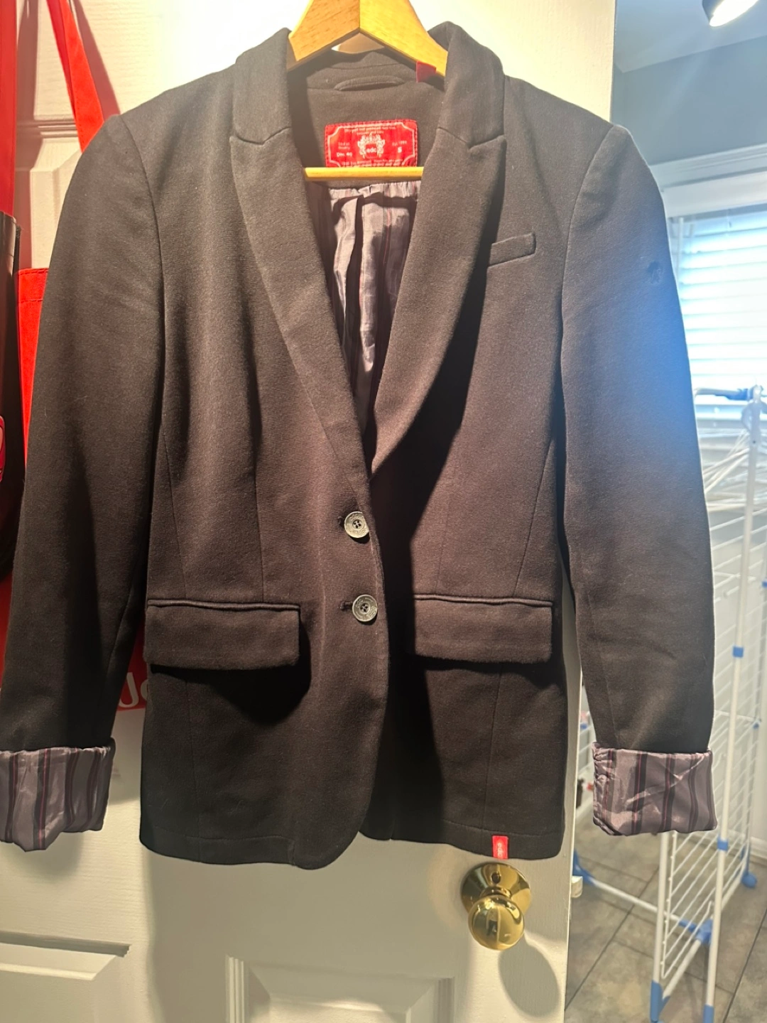 Women's black blazer. Size small. Two button closure. Features urban look black/red striped lining - great for folding up the cuffs. Good condition, gently worn.