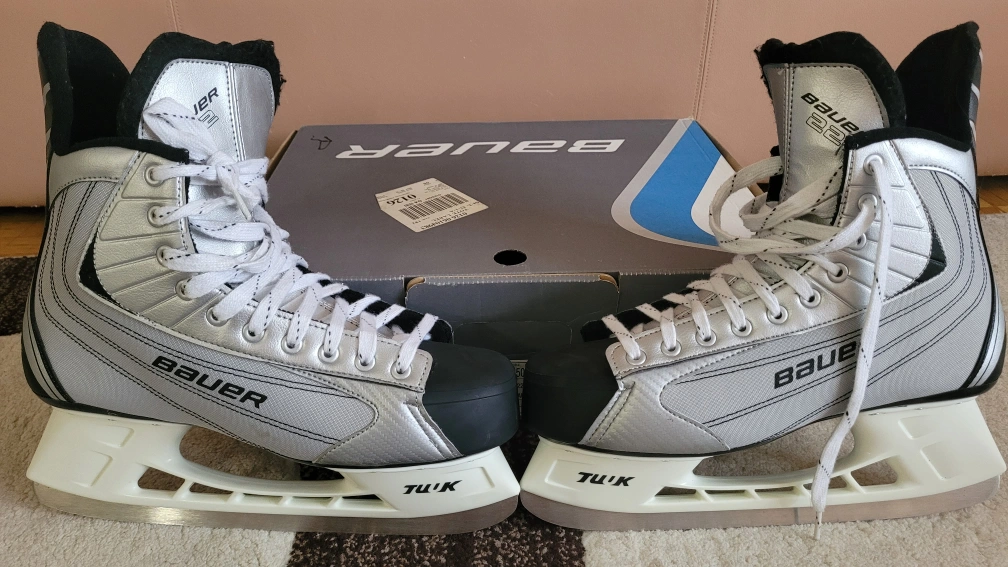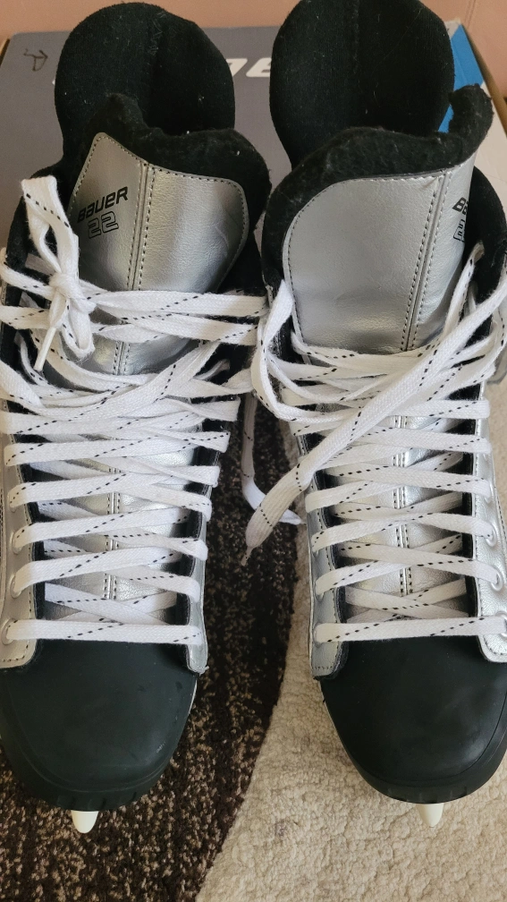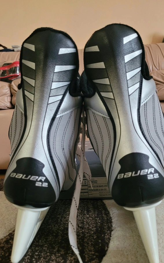 Bauer 22 SR ice skates. Size 11. Silver and black. Like new condition - used just once. Comes with the original box.