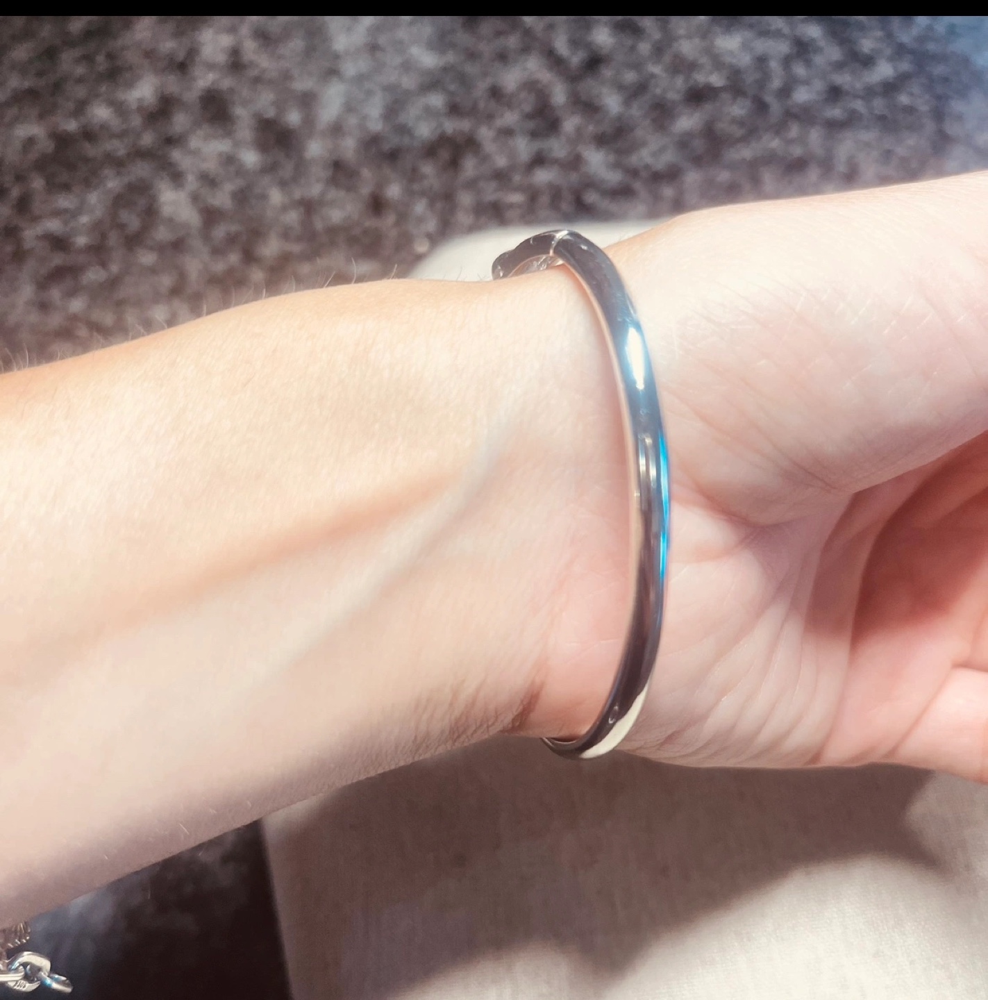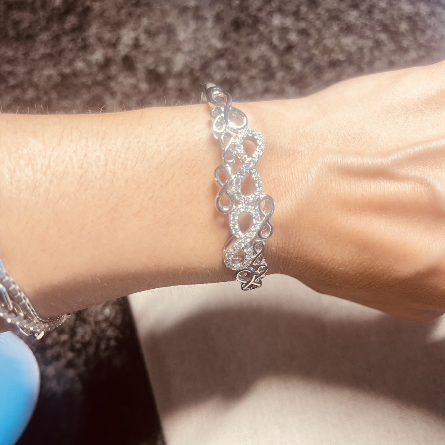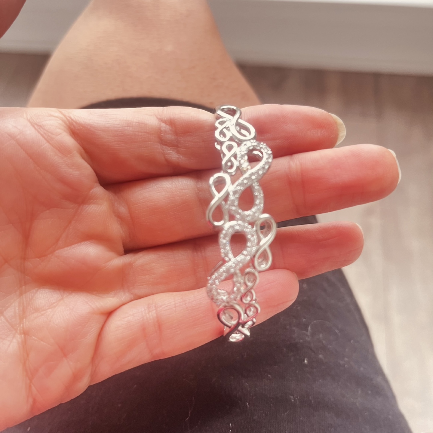 Stunning silver bracelet. Features an infinity design. Set with sparkling cubic zirconia stones. Beautiful and delicate.
