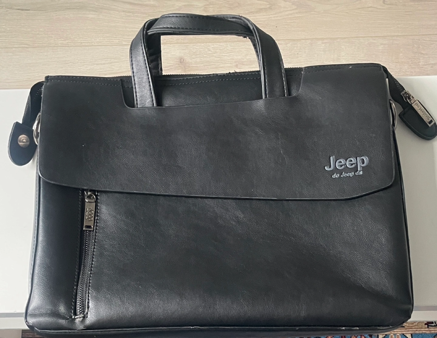 Black leather laptop bag. Features two top handles and a detachable shoulder strap (one of the clip hooks has been broken that reflects the price).