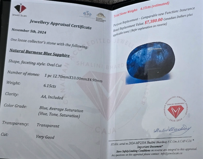 Beautiful deep blue Burmese sapphire. Oval cut. 6.15 carats. Comes with appraisal certificate from JewelScan.ca. Perfect for jewellery making or a collector's item.