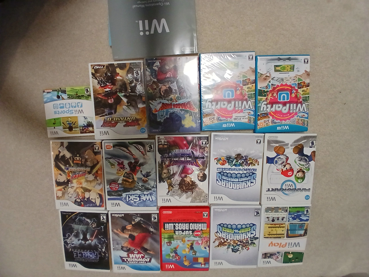 Collection of pre-owned Nintendo Wii games. Titles include various genres and ratings. Includes cases and manuals where applicable.