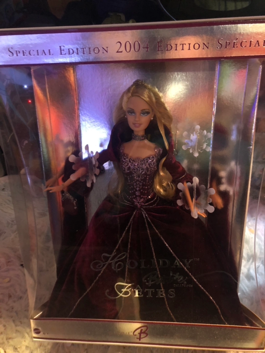 The doll is still in a sealed box and brand new. Details: For over a decade, Barbie doll has celebrated each holiday season with a beautiful doll commemorating the year. In 2004, Holiday Barbie doll, joins this proud tradition dressed in a rich, rose velvet gown embellished with glittering sparkles. And, for the first time, this special rose-velvet 2004 Holiday Barbie doll is available exclusively from Sears. Come join the holiday Barbie® Doll collecting tradition with this splendid keepsake Sears Exclusive Holiday Barbie doll.