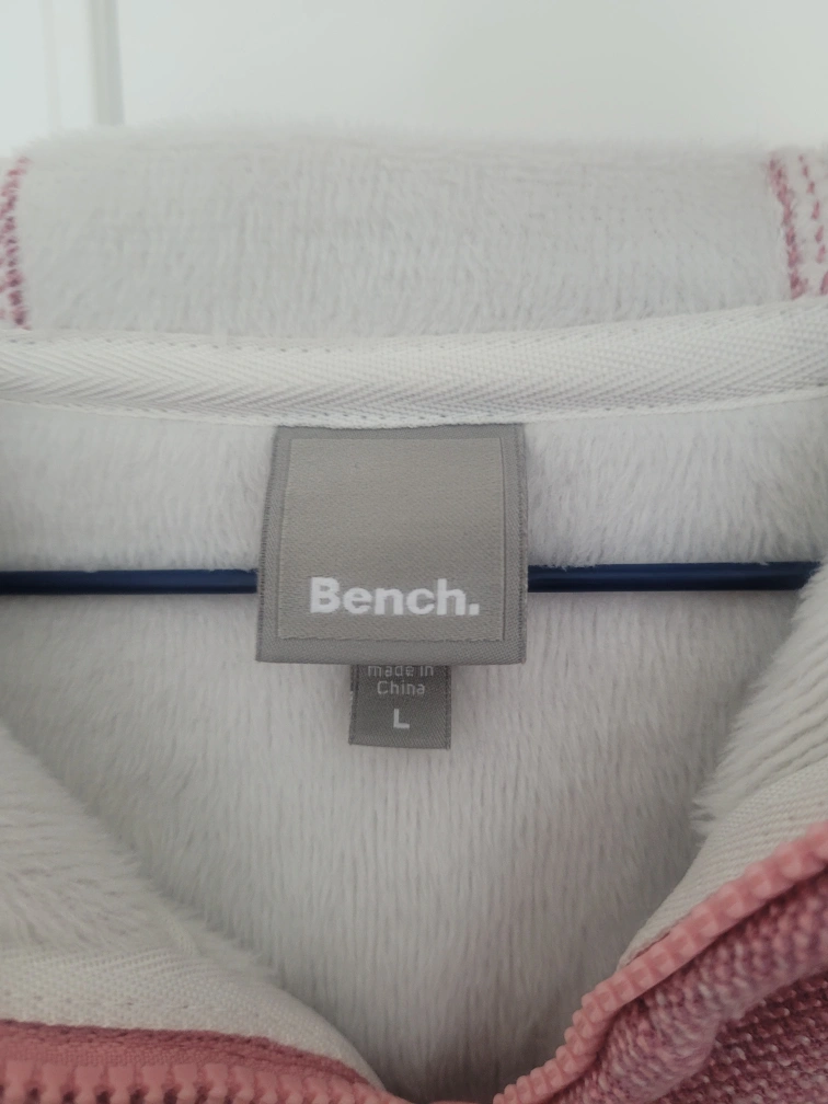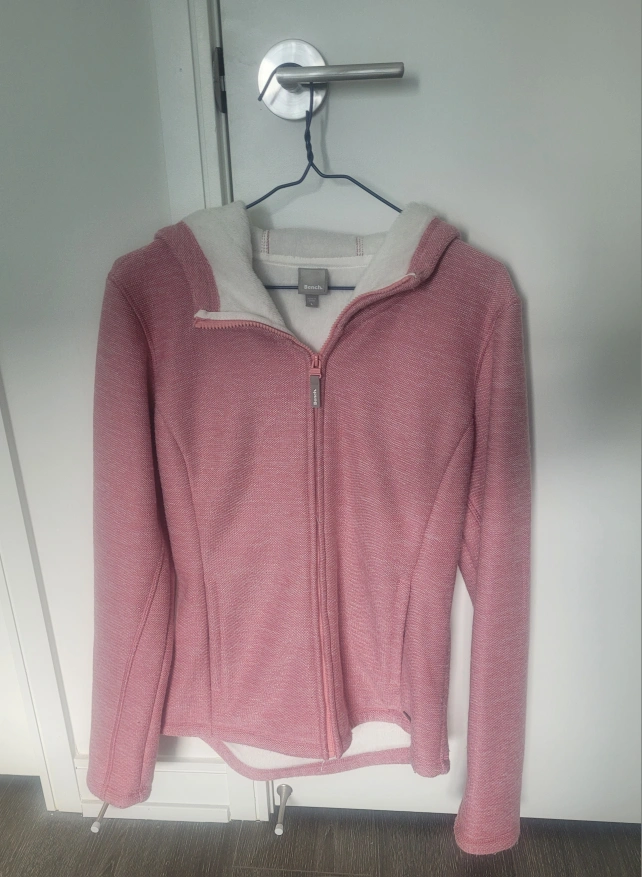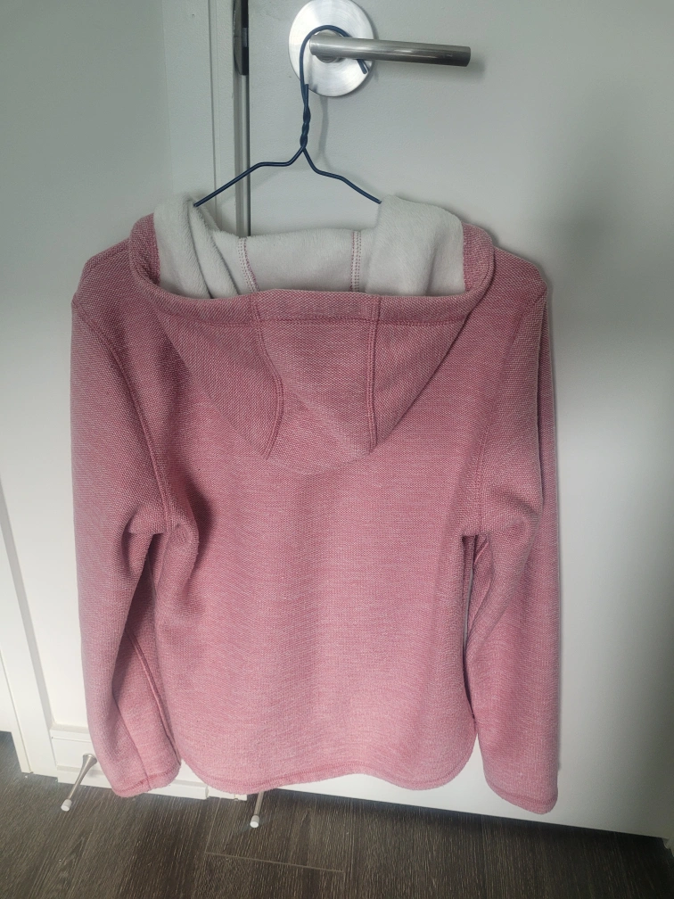 Women size large pink zip-up hoodie. Soft and cozy. Features a sherpa-lined hood. Great for layering.