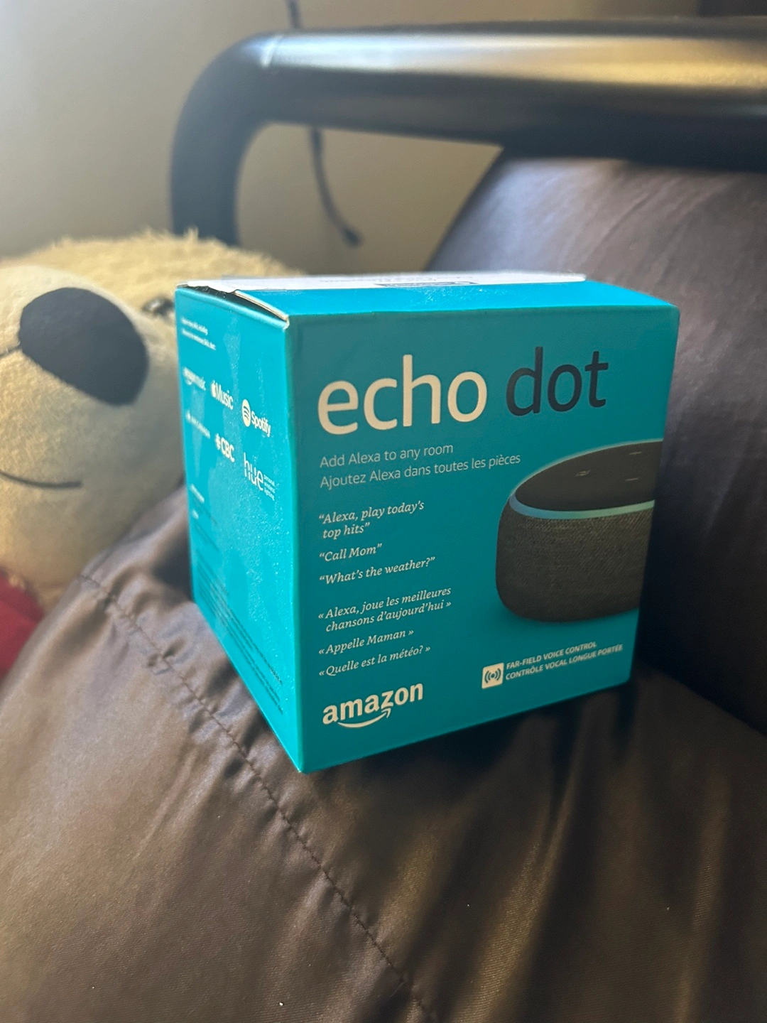 Smart speaker with Alexa. New in box, has never been opened or used. Features Bluetooth audio, microphone on/off button. Charcoal/grey colour.