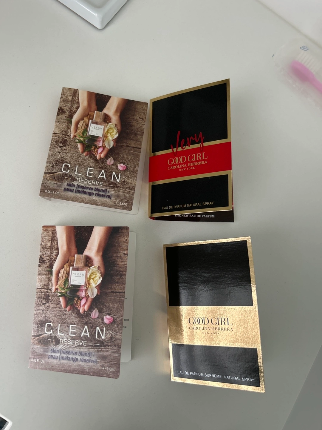 Collection of perfume samples. Includes Clean Reserve, Carolina Herrera Good Girl. Perfect for trying before committing to a full-size bottle.