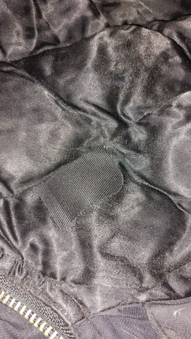 Was patched on the collar with an iron on patch for durability from a scratchy beard. Blends in and can't be seen Excellent used condition and very warm.