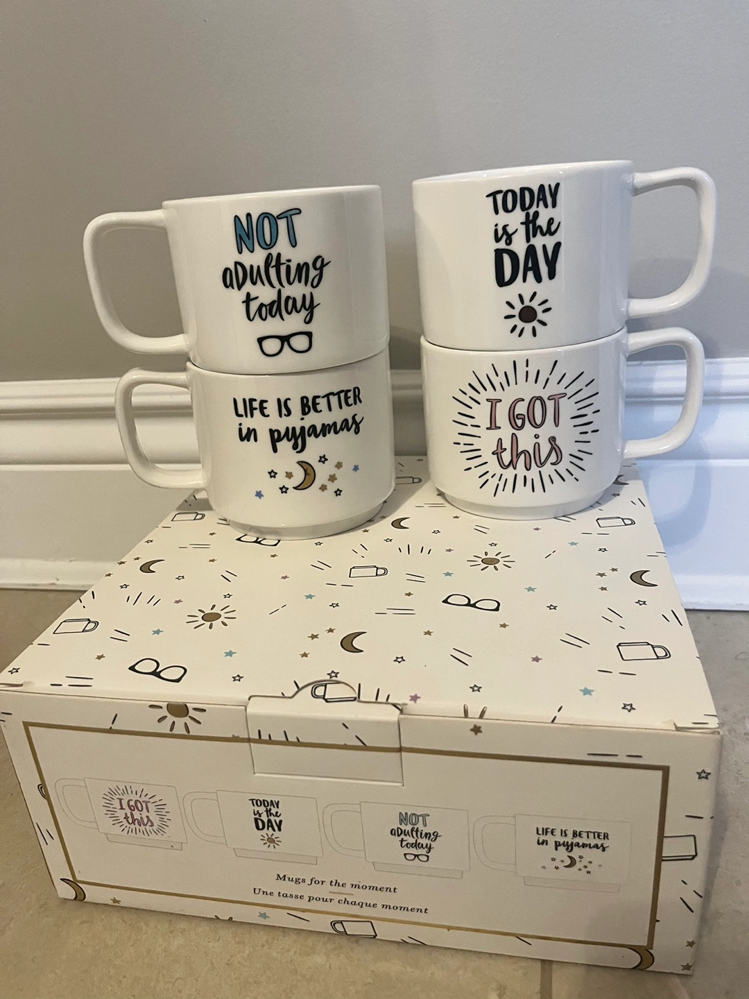Four ceramic mugs. Stackable design. Various encouraging phrases printed on each mug. Great for coffee, tea, or hot chocolate.