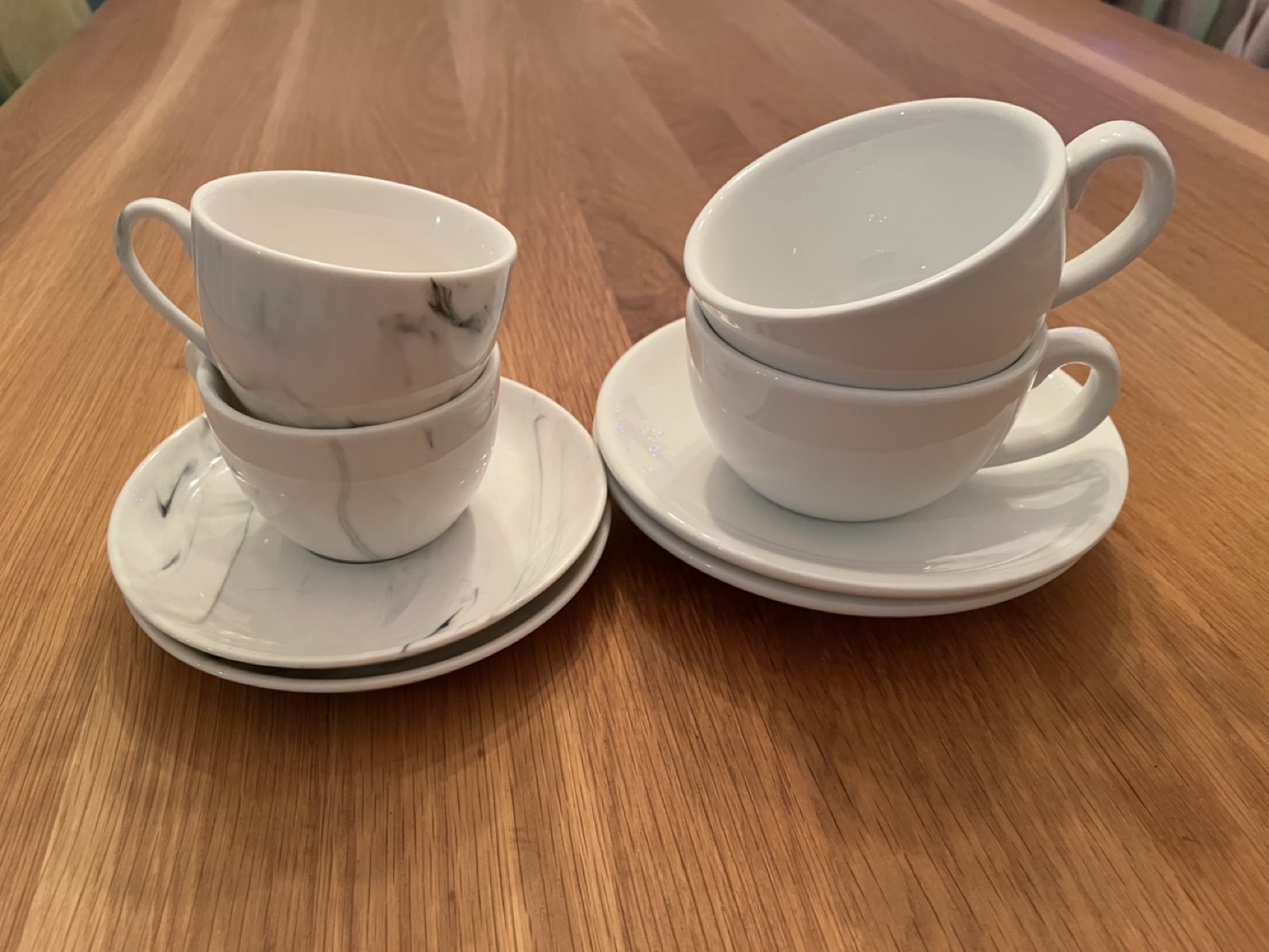 Two sets of coffee cups and saucers. One set features marble-patterned cups and saucers (used for espresso). The other set features plain white cups and saucers (used for lattes). All are in good condition.