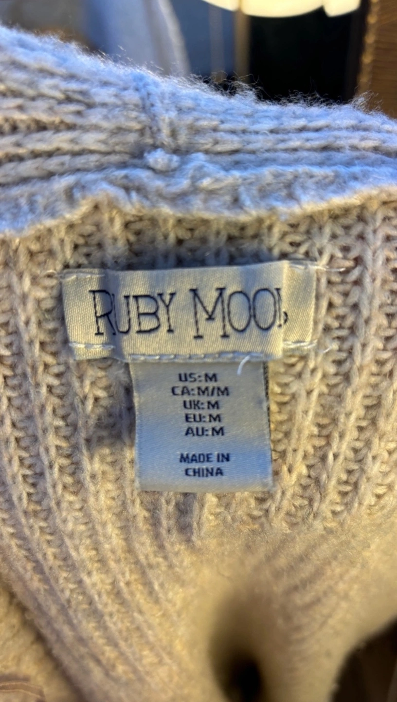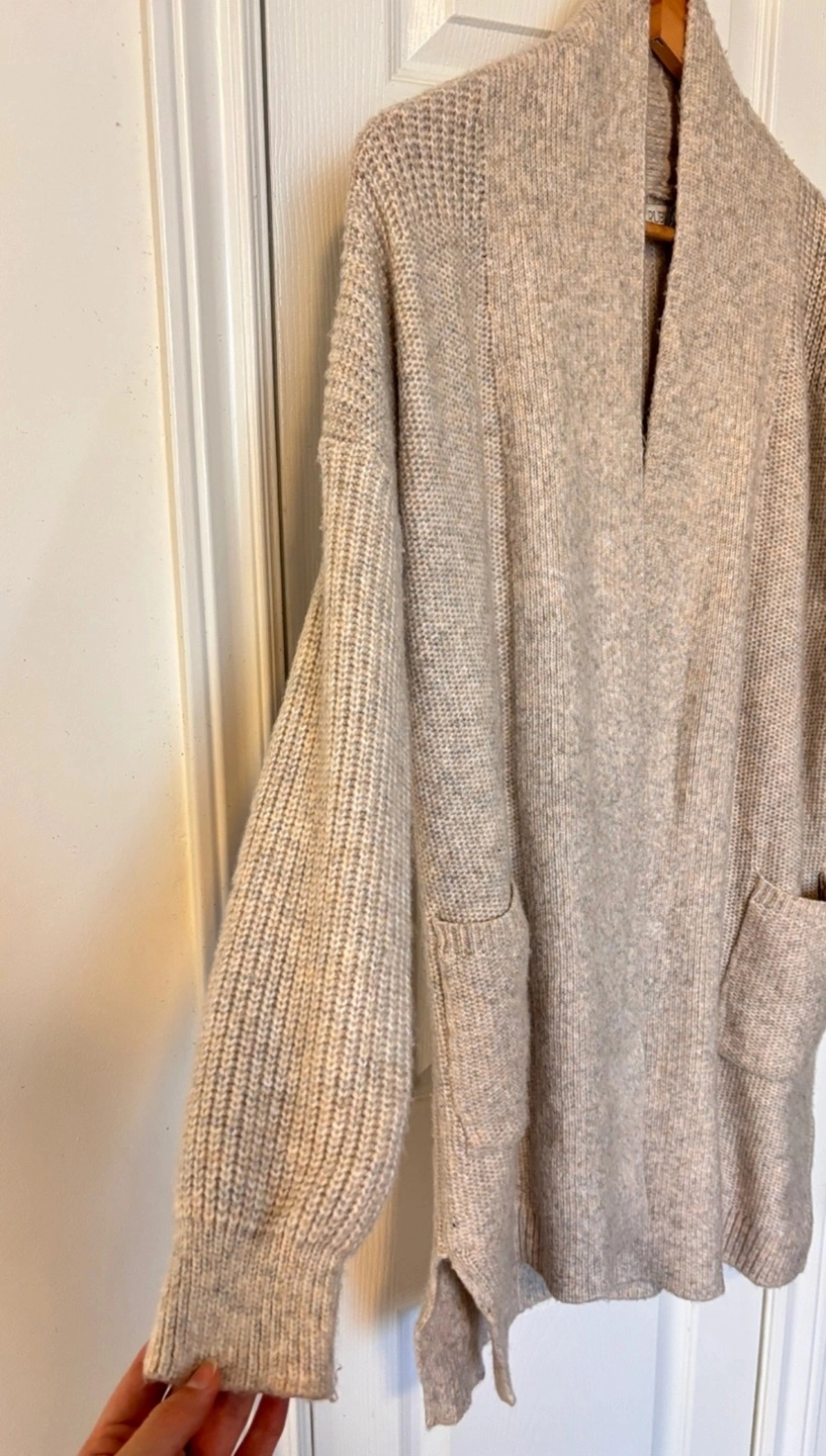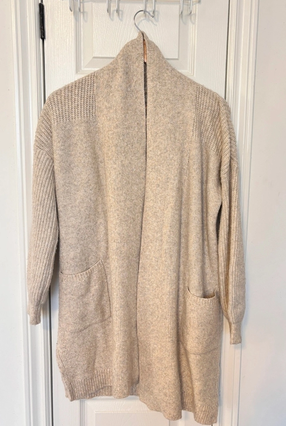 Long cardigan with pockets. Size M. Like new, wore it one time only. Warm, cozy and nice material. It’s creamy color