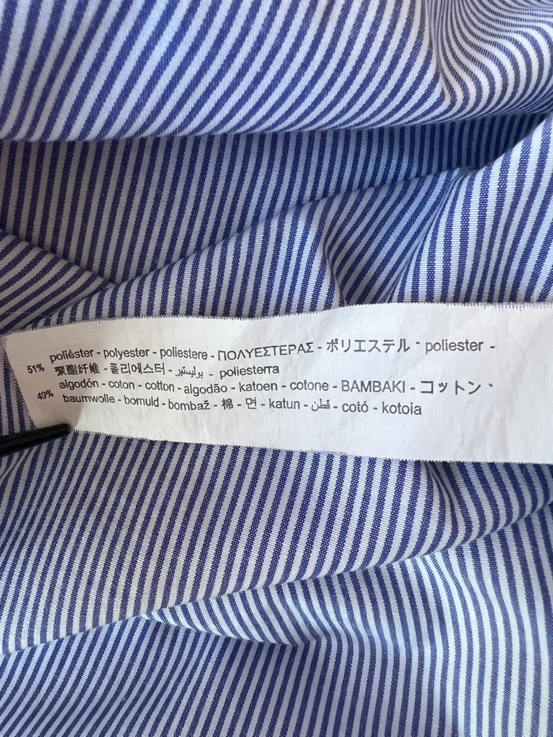 Women's button-down shirt. Blue and white vertical stripes. Features a unique red and white ribbon detail on the collar and pocket. Rolled-up sleeves. Size Medium.
