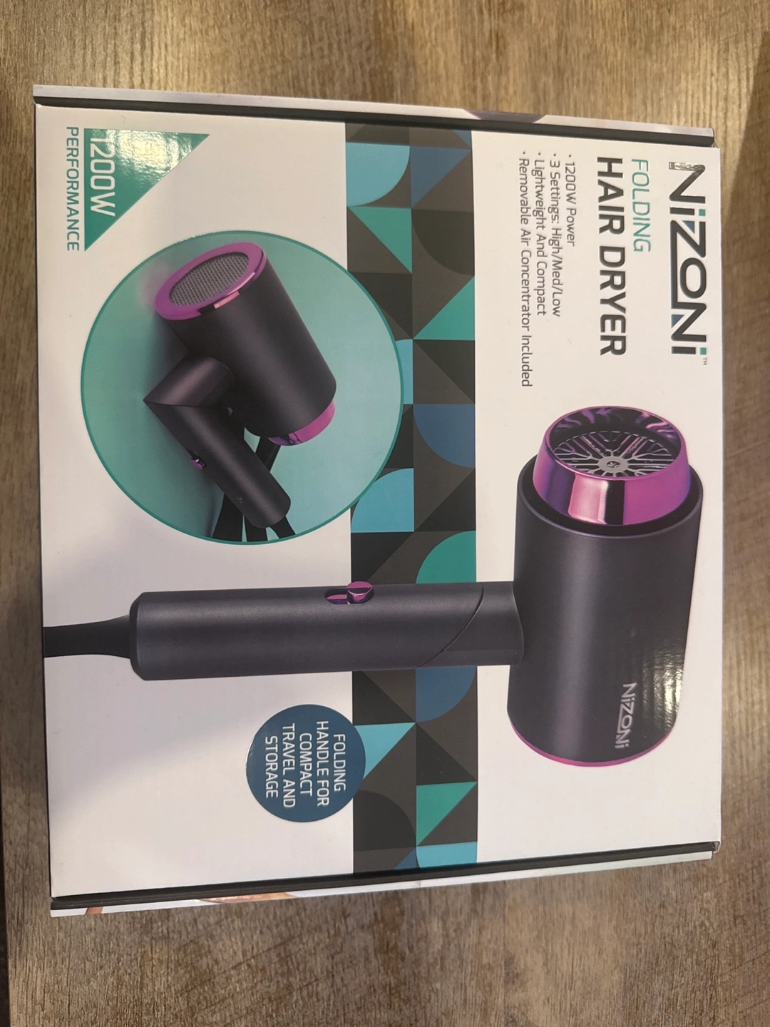 1200-watt hair dryer. Three heat settings: high, medium, low. Foldable handle for compact storage. Lightweight and convenient for travel. Removable air concentrator included. 78inch power cord.