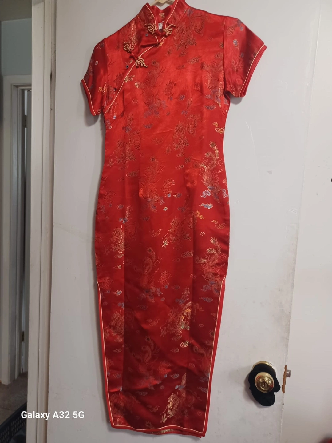 Beautiful red cheongsam. Features short sleeves, mandarin collar, and side slits. Embroidered with gold dragons. Elegant and festive.