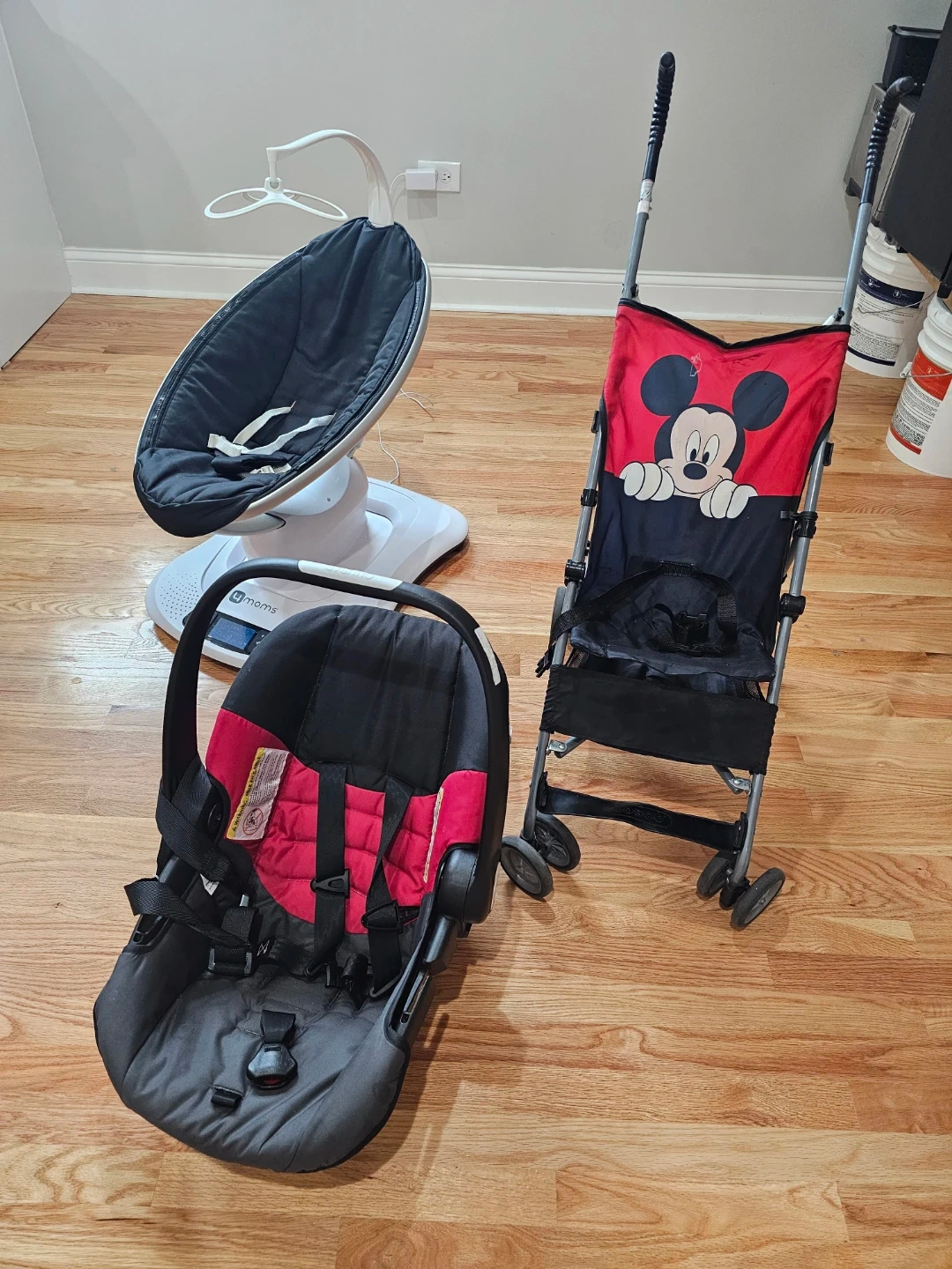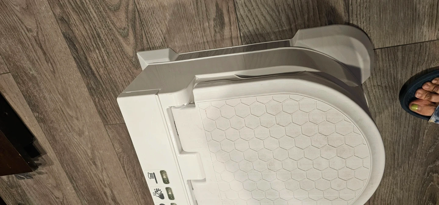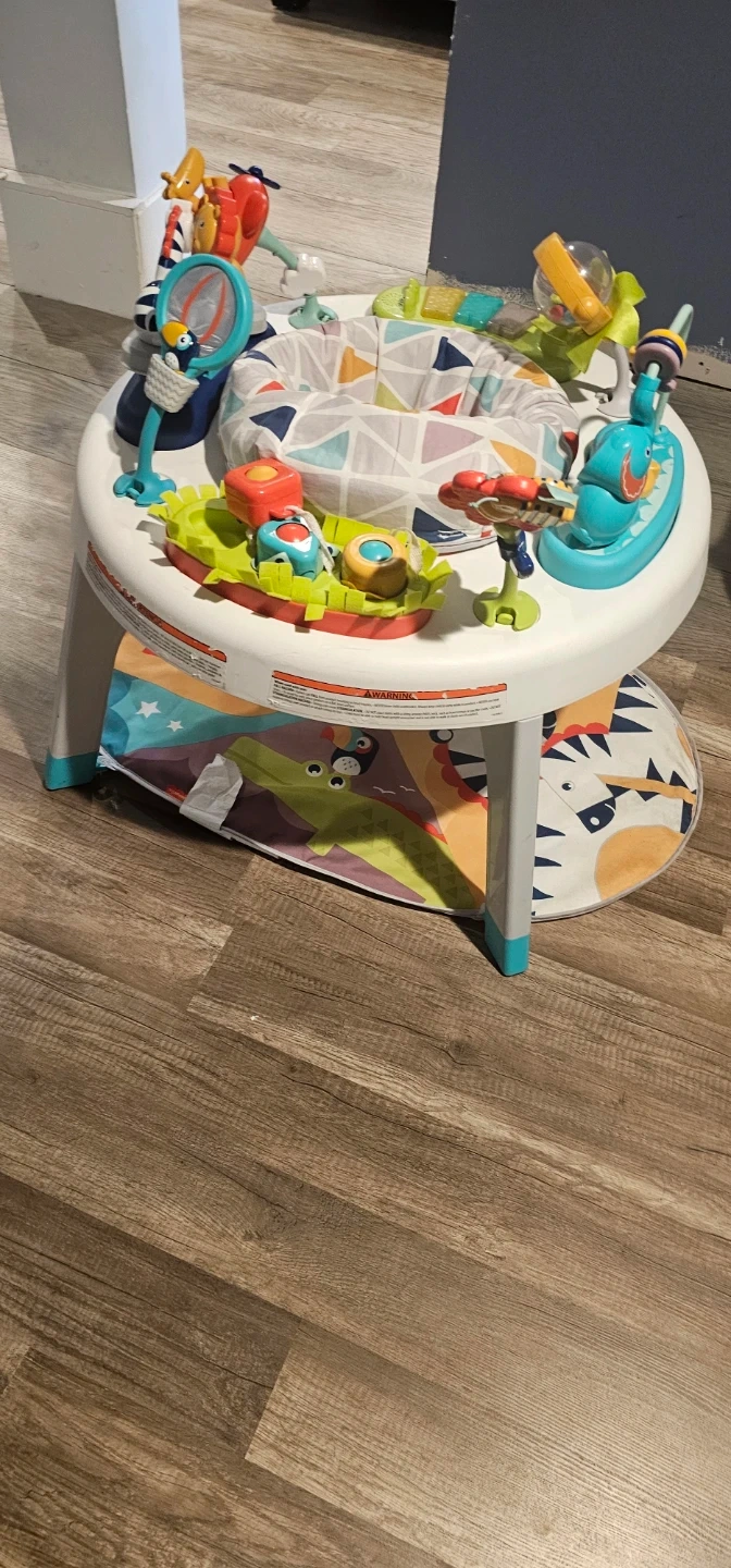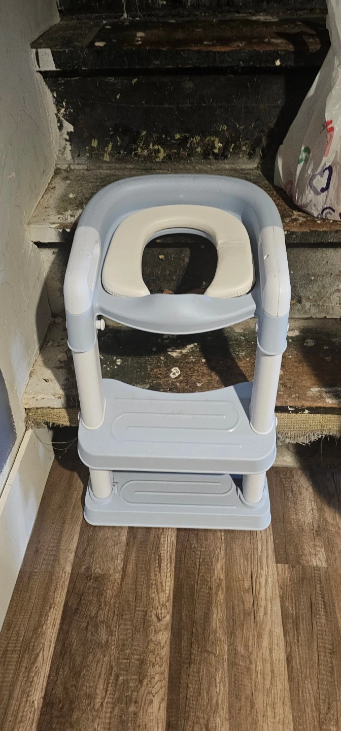 This baby toilet training seat features a comfortable padded seat and a step for your little one. It's designed to help with potty training. Made of plastic.